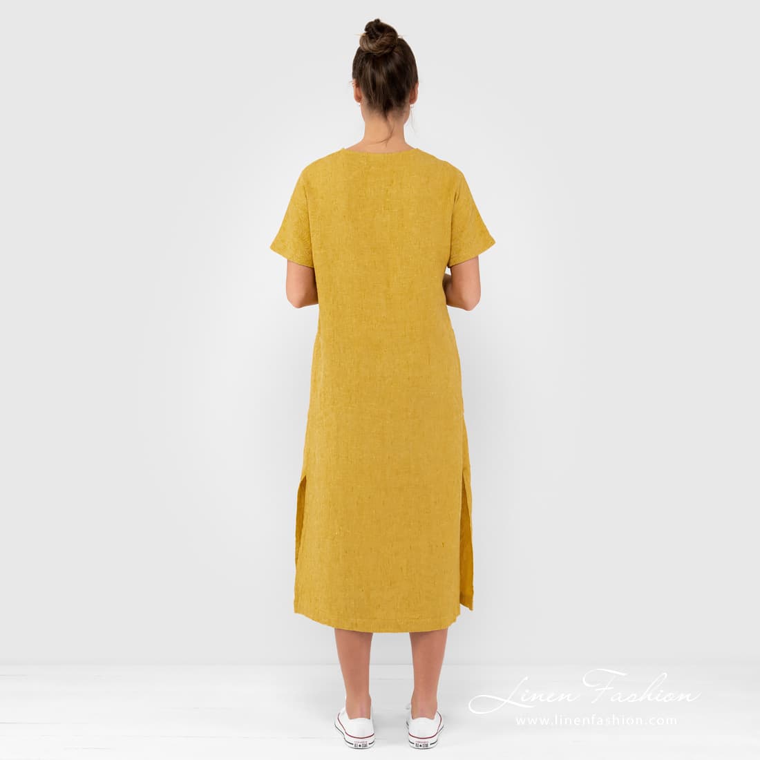 - Produktmodell: A-linje silhuett, løs passform, midi-lengde, korte ermer