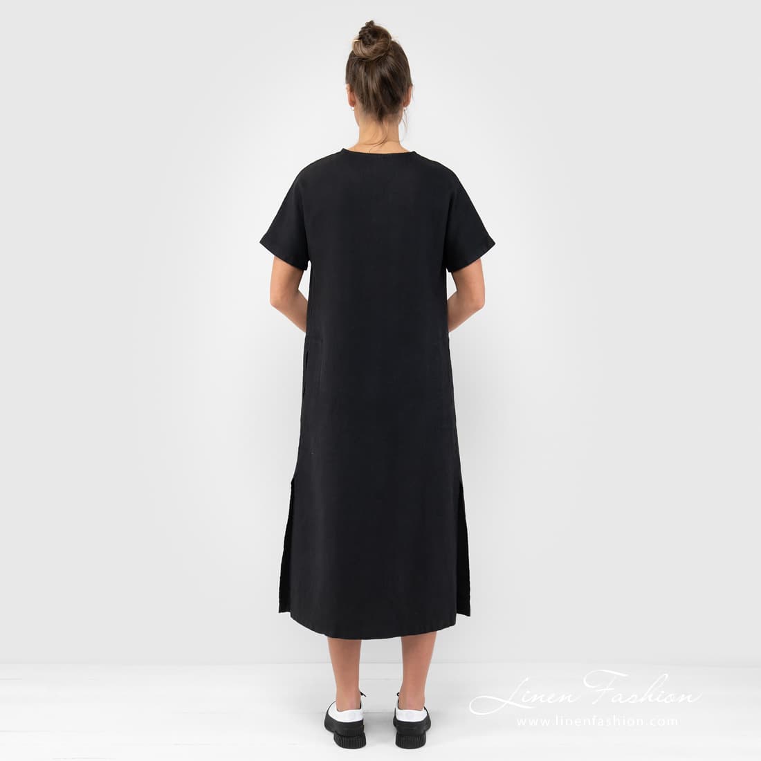 - Produktmodell: A-linje silhuett, løs passform, midi-lengde, korte ermer
