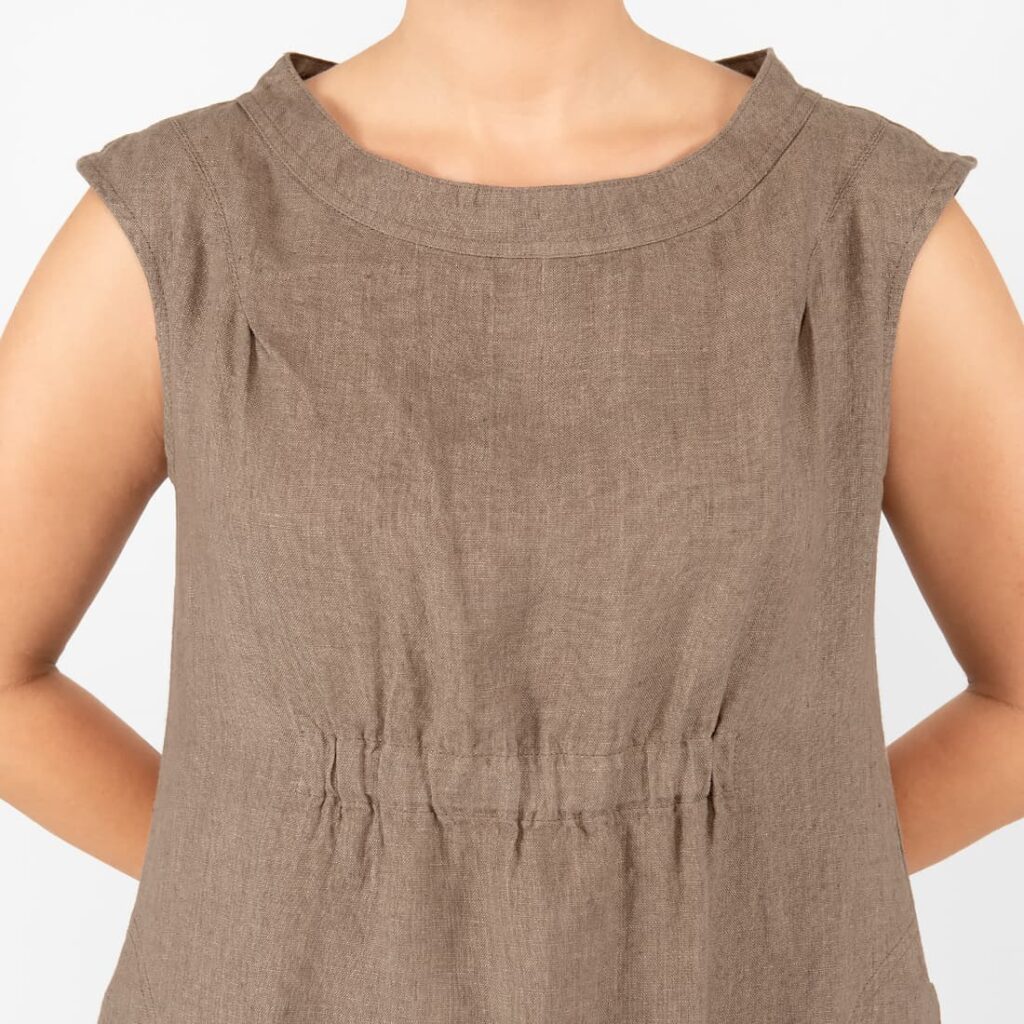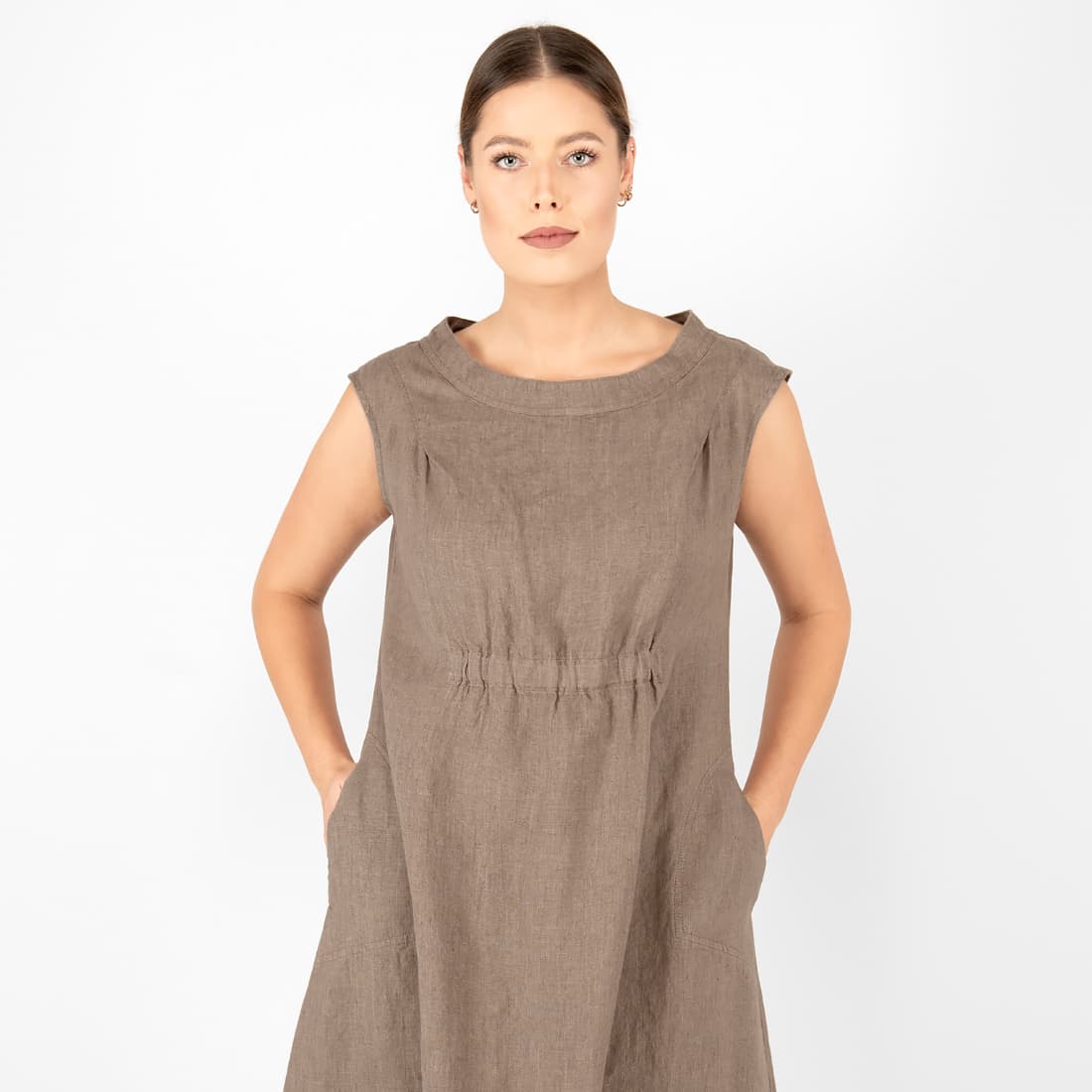 - Detaljer: rund halsutskjæring, med lommer, elastisk rynking under brystet og på nederkant
