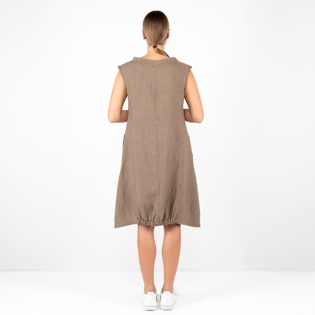 - Produktmodell: A-linje silhuett, løs passform, knelengde, ermeløs