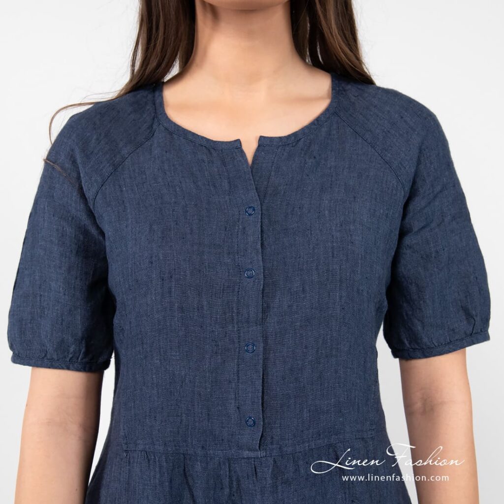 - Detaljer: rund hals, lommer i sidene, trykknapper fra halsen og ned, volangkant nederst