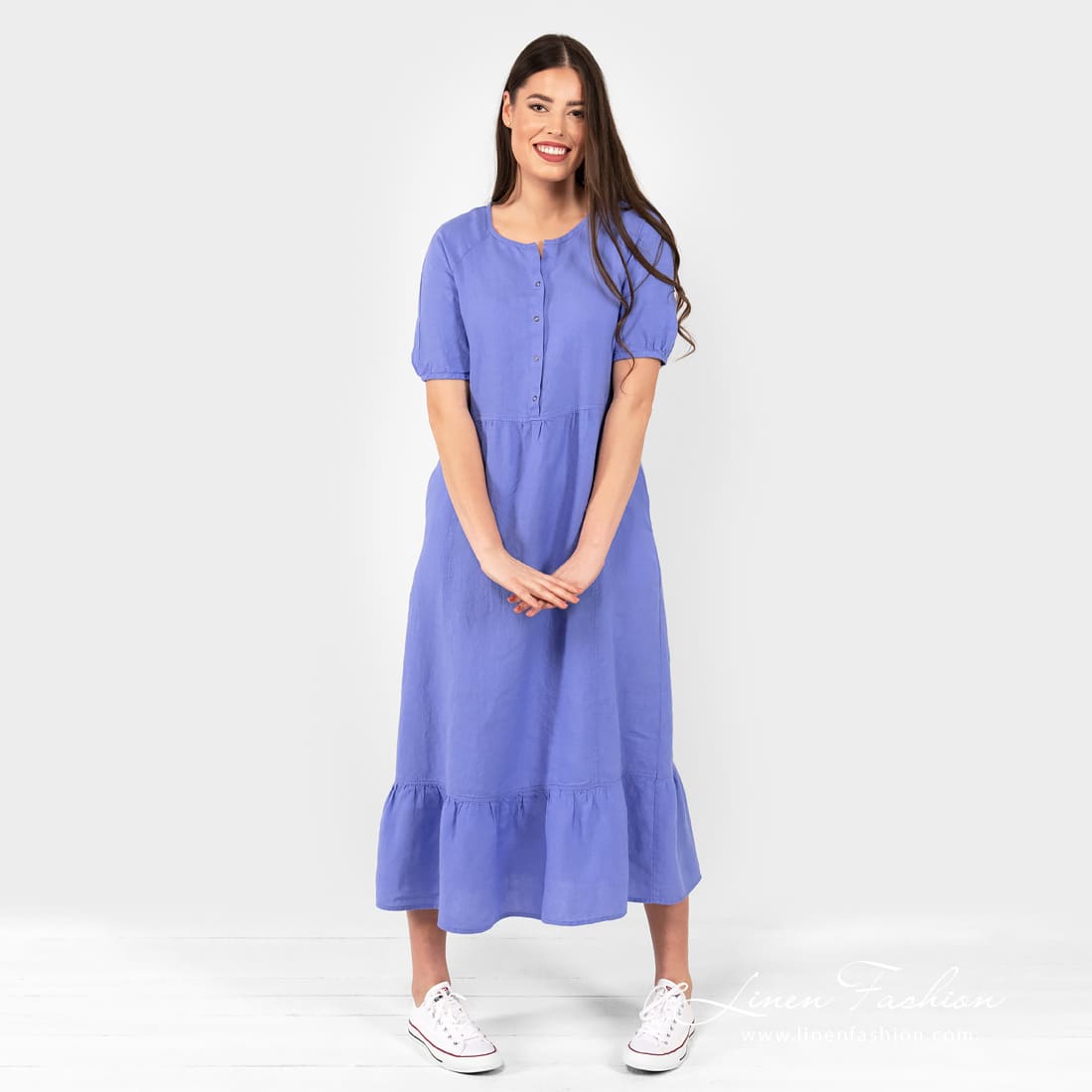 - Detaljer: rund hals, lommer i sidene, trykknapper fra halsen og ned, volangkant nederst