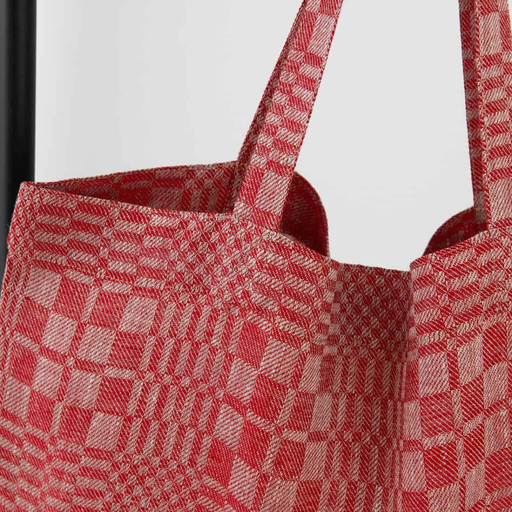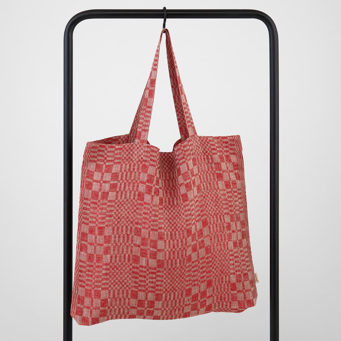 - Farge: blanding av naturlig lin (ufarget, brungrå) og rødt garn
