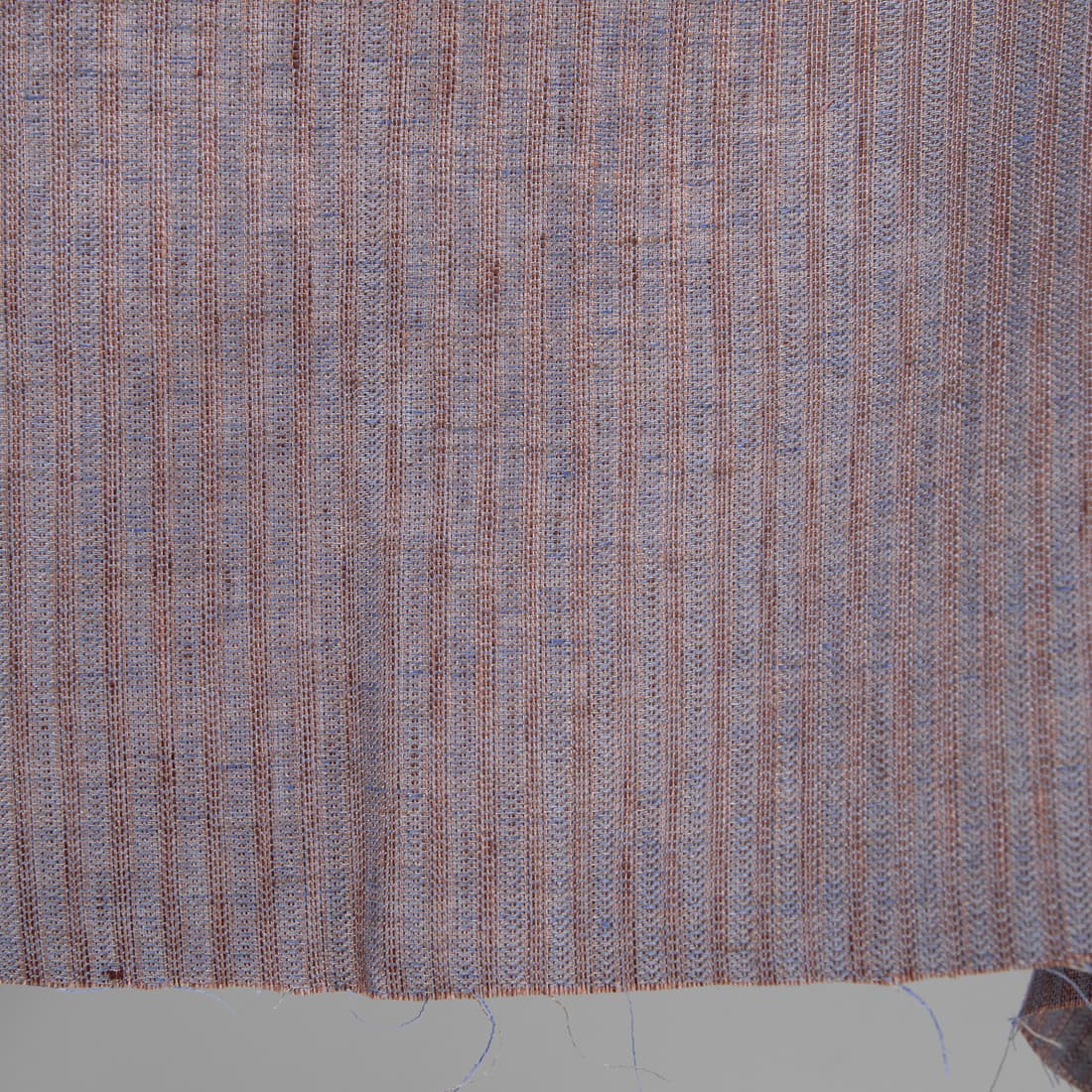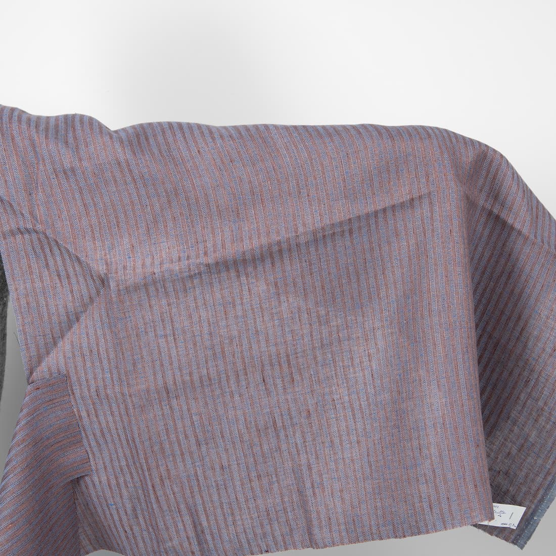 • Linstoff med vertikale småmønstrete striper vevd av brunt, lysebrunt, mørkegrått og lyseblått garn