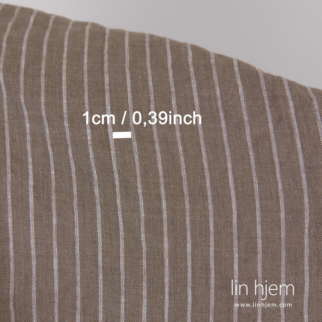 • Linstoff stripete vevd av gråbrunt (mørk beige) og hvitt garn