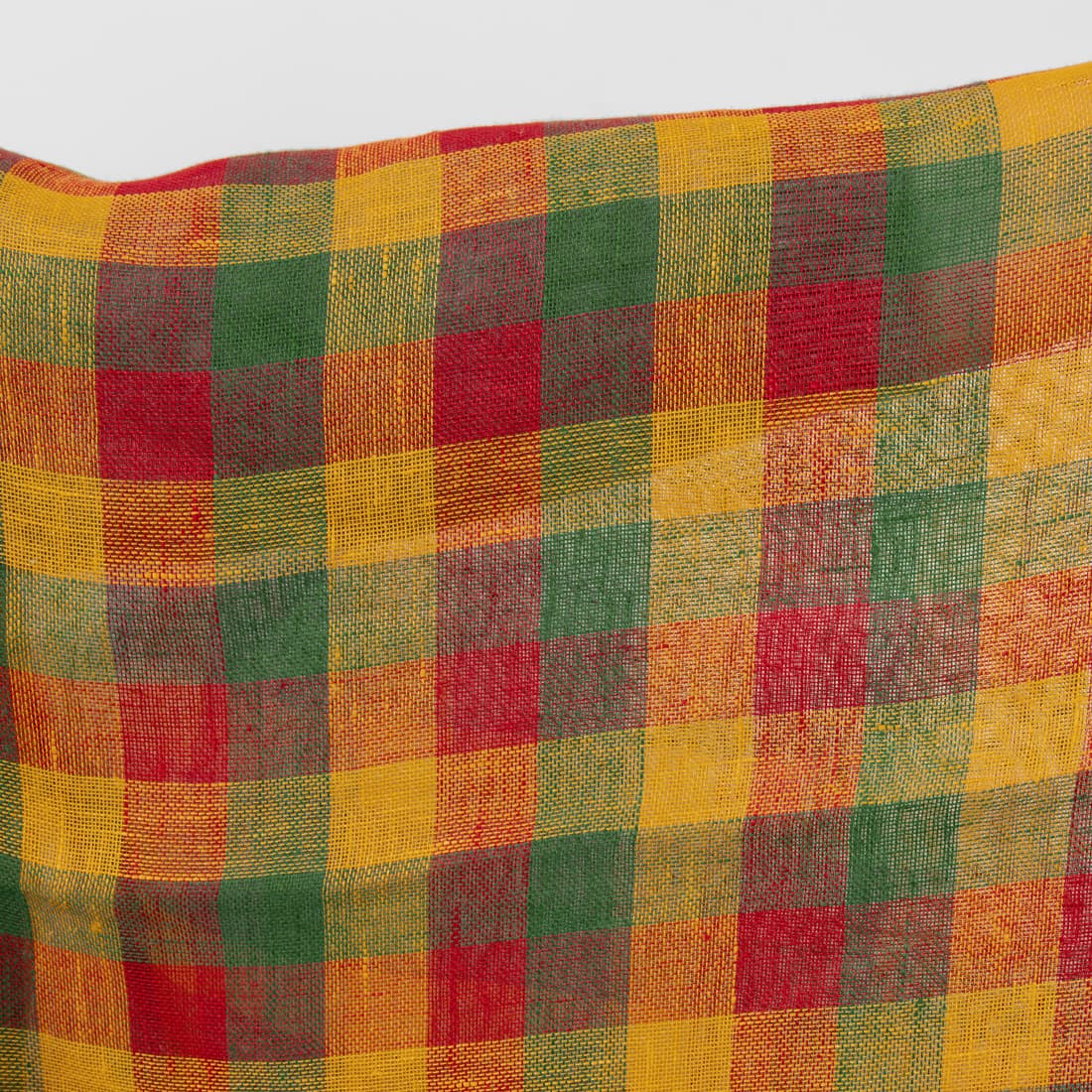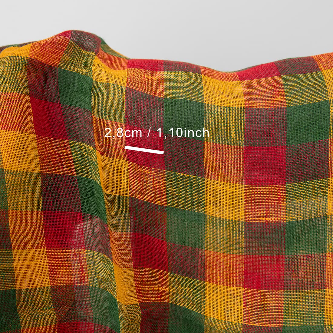 • Linstoff gjennomsiktig rutete, vevd guloransje, smaragdgrønt og skarlagenrødt garn