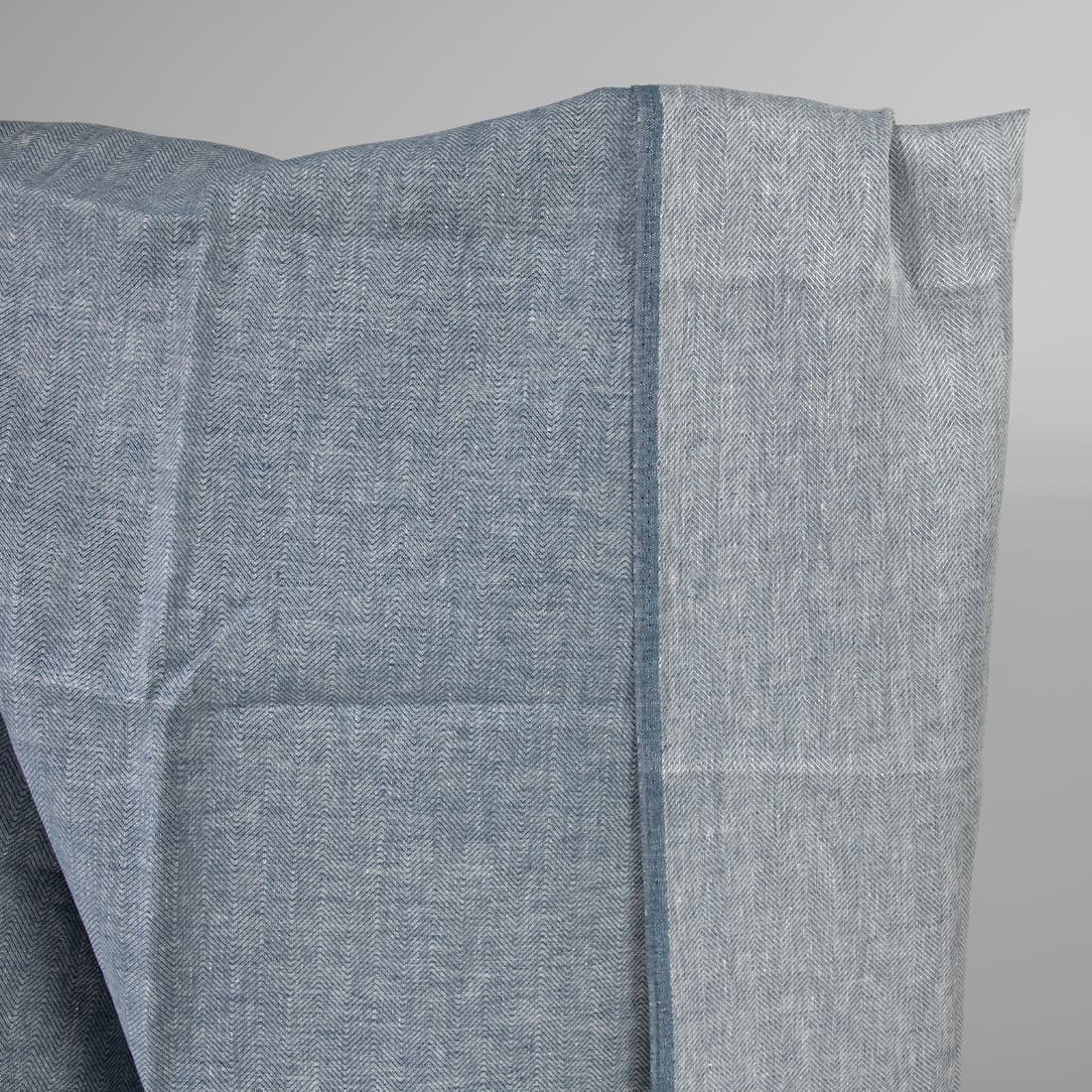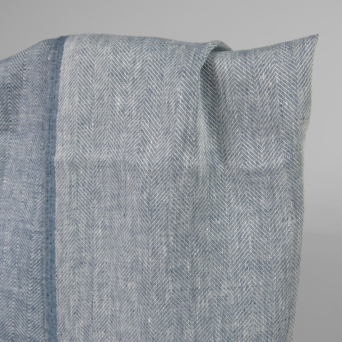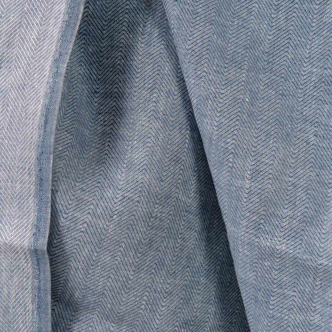 • Linstoff med fiskebeinsmønster vevd av hvitt og denimblått garn