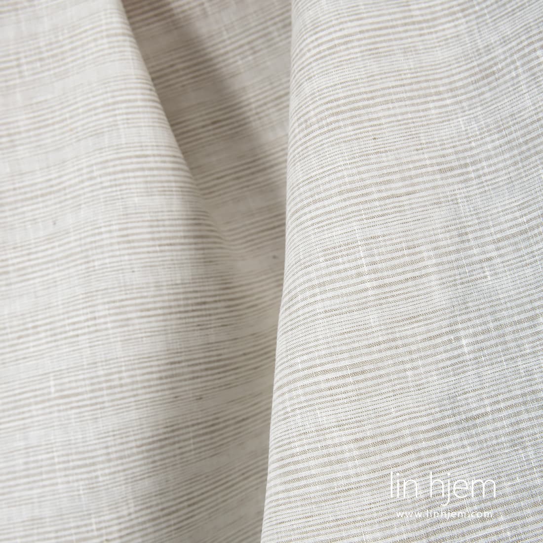 Linstoff i horisontale tynne beige striper på melkehvit bakgrunn. Stoffet er lett, tettvevd, holdbart. Passer til å sy klær, hjem tekstil produkter.