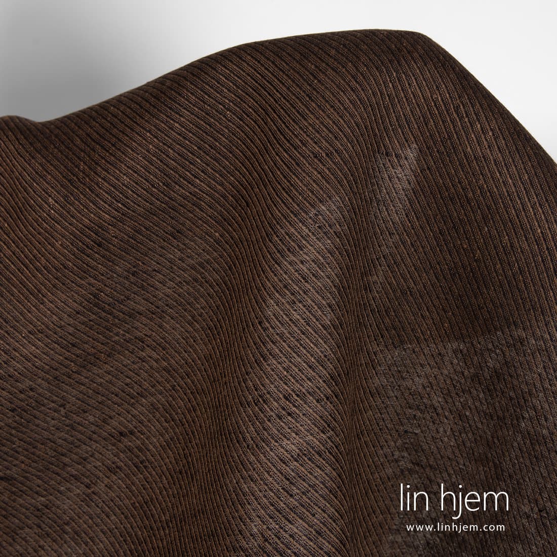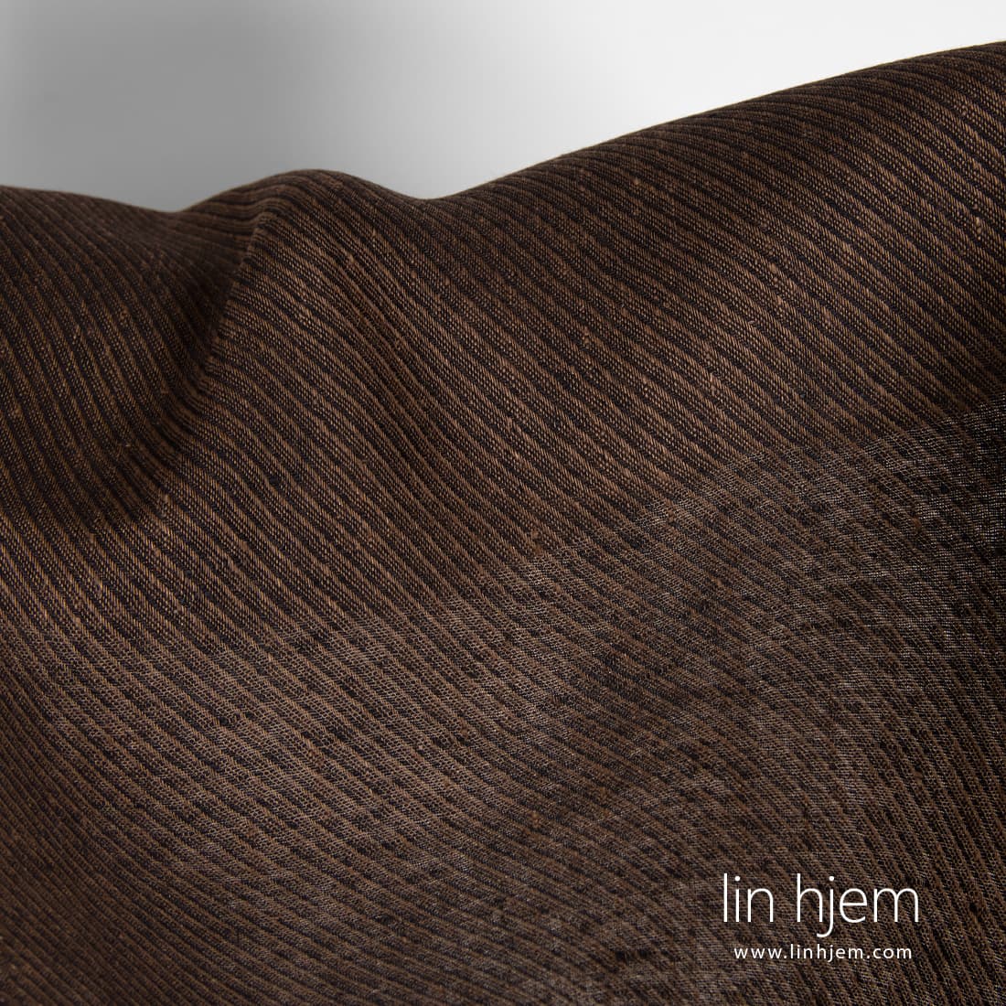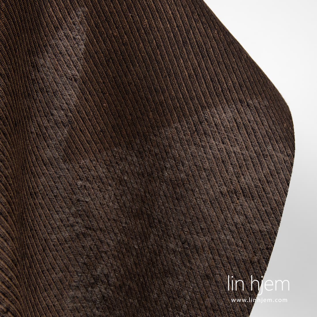 Linstoff i brune striper som ble vevd av brune og svarte garn. Striper vevd diagonalt. Holdbart, tettvevd, middels tykkelse stoff som passer til å sy hjem tekstil produkter, klær.