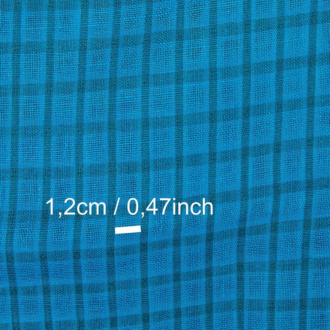 • Linstoff i gjennomsiktige ruter, vevd intenst blått og mørkt turkis garn