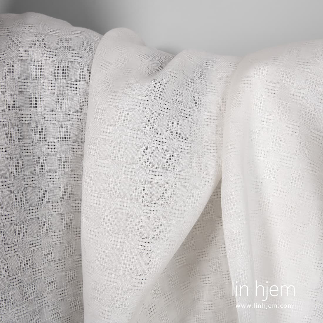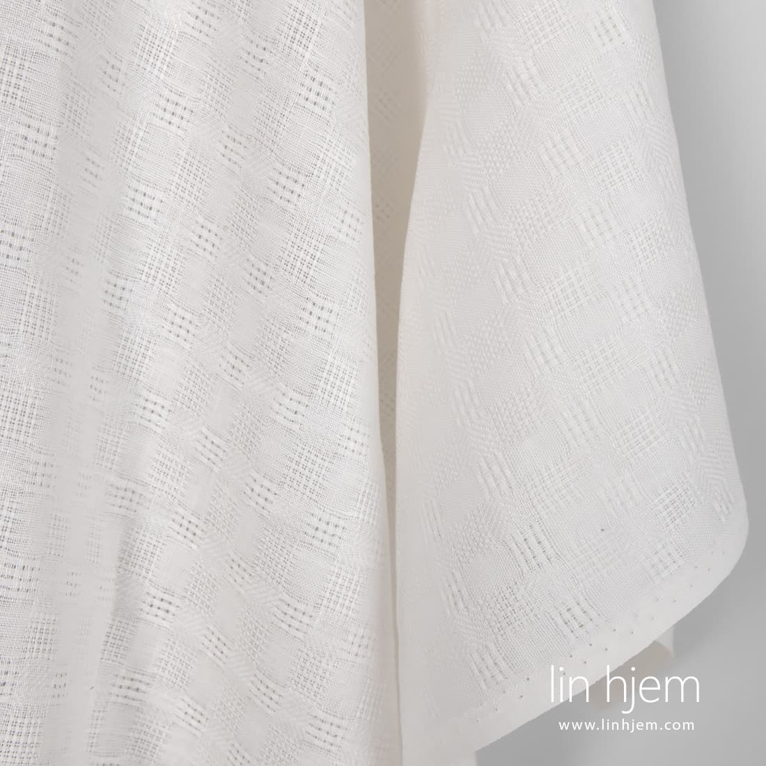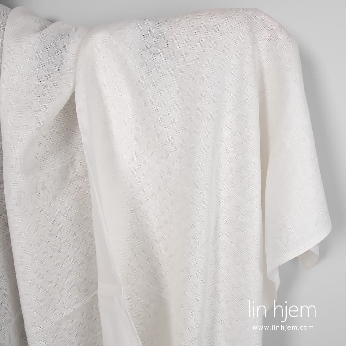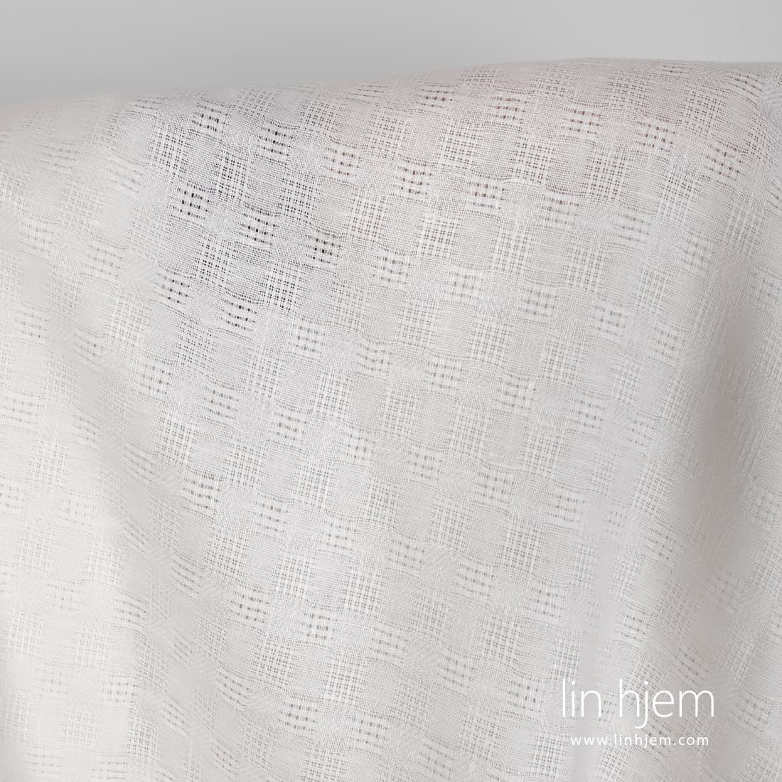Melkehvitt linstoff i gjennomsiktige og tettvevde striper. Holdbart, middels tykkelse. Passer til å sy dekorative duker, servietter, gardiner, sengetøy og klær.