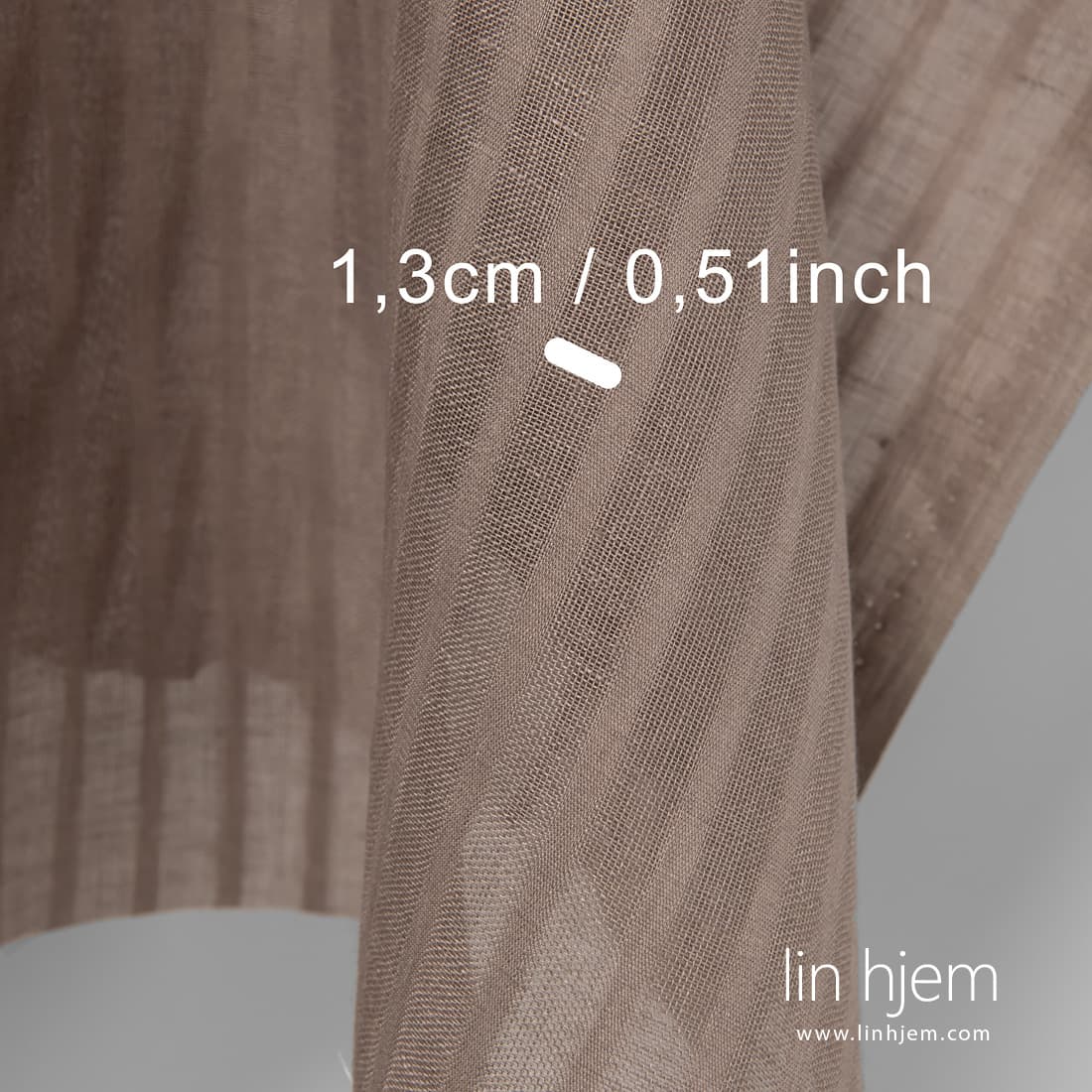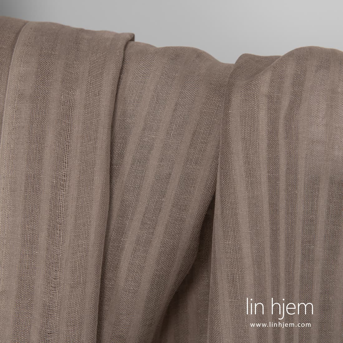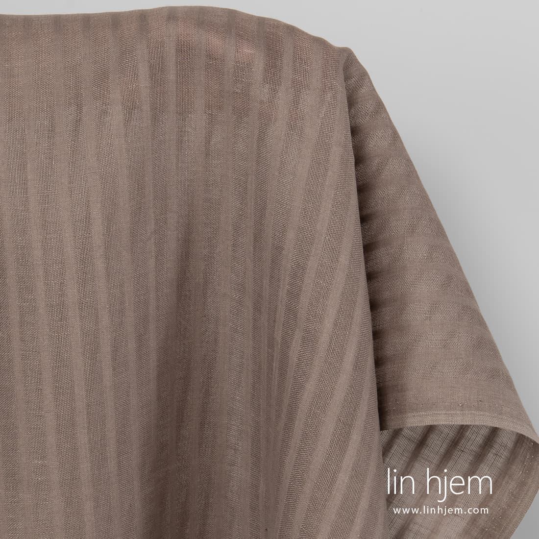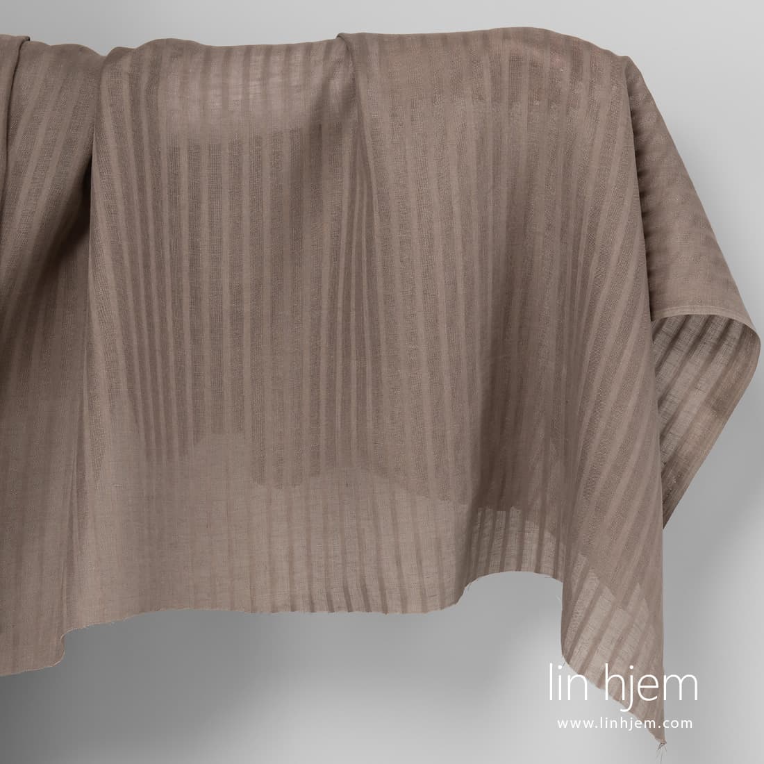 Linstoff i grå farge med gjennomsiktige striper vevd vertikalt. Dette linstoffet er lett og passer perfekt til å sy hjem tekstil produkter.