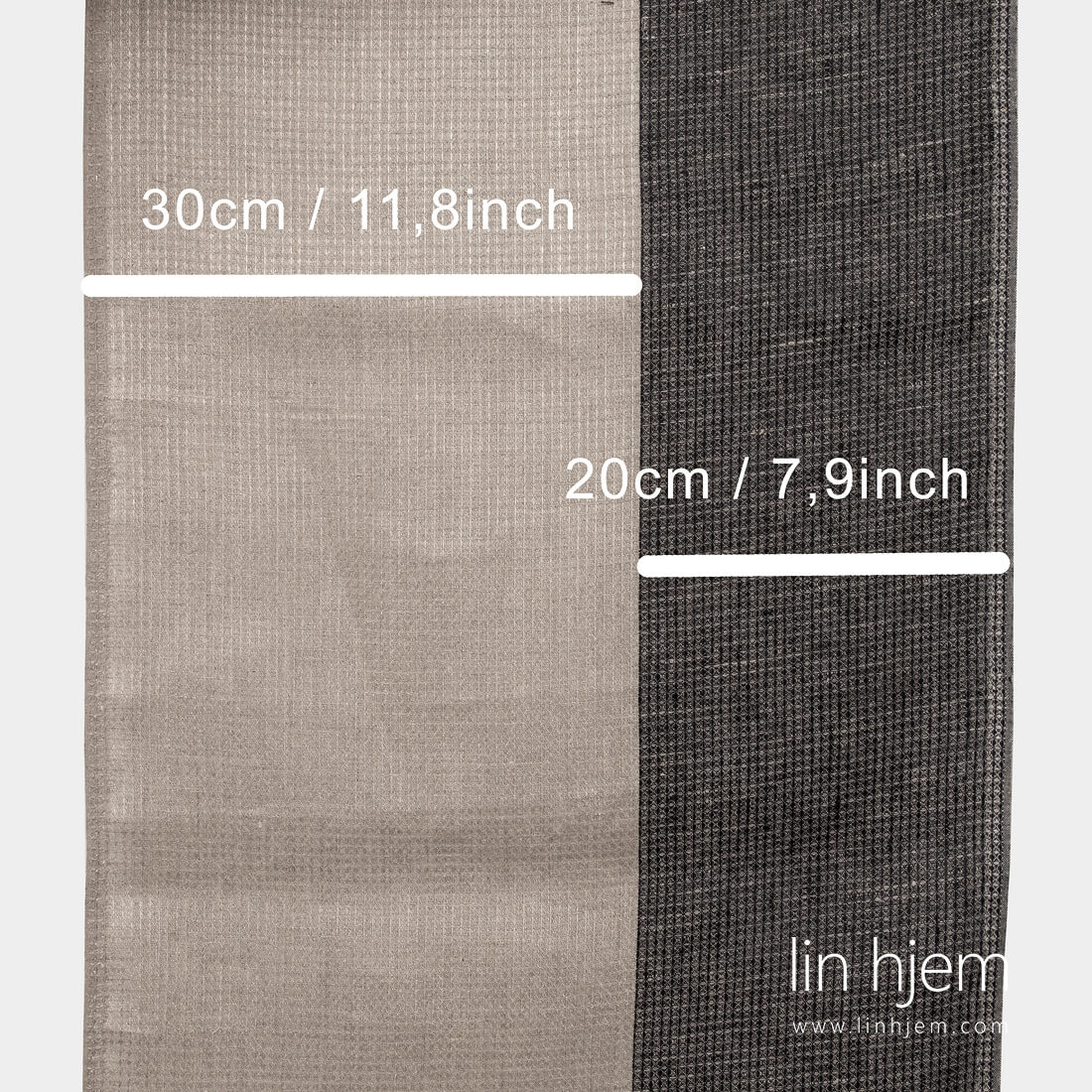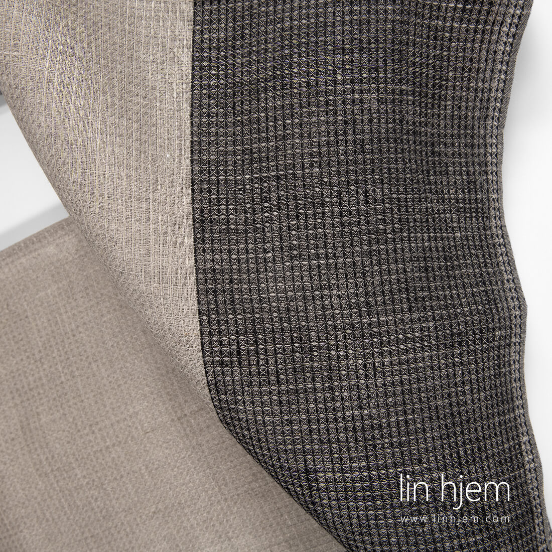 Linstoff i gråsvart farge vevd i små ruter fra svarte og naturlig(ufarget) garn. Rutene kommer til å se litt lysere ut etter å ha vasket det når stoffet krymper litt. Dette linstoffet er veldig holdbart, tettvevd, middels tykkelse, absorberer fuktighet godt. Brukes til å sy kjøkkenhåndklær.