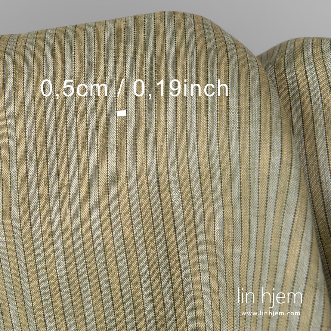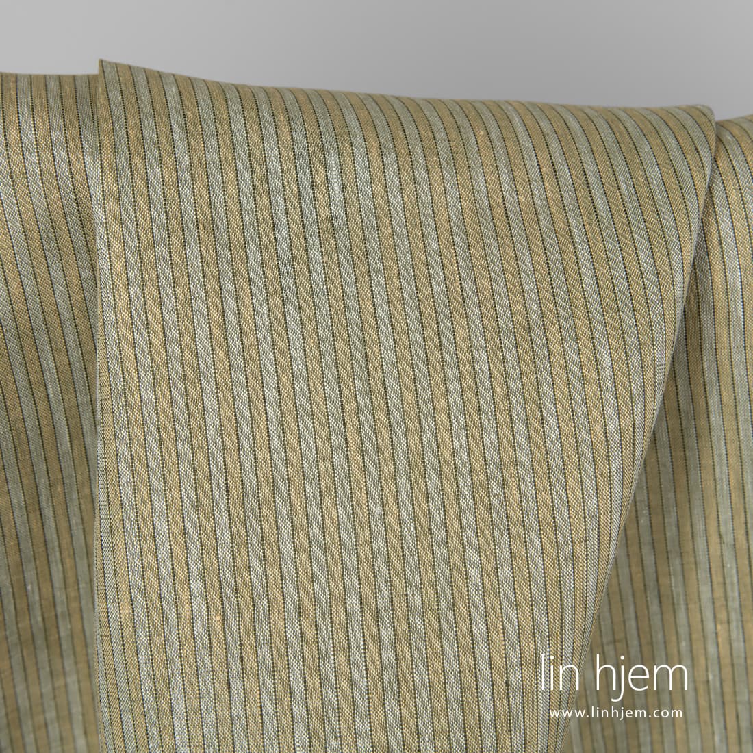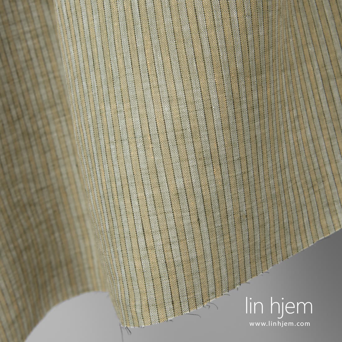 Linstoff i grønnaktige og gulaktige striper vevd vertikalt. Hvite, mørkegrønne, grønne og gulaktige garn ble brukt. Lett, holdbart, tettvevd, middels tykkelse stoff. Dette stoffet passer best til å sy klær, sengetøy, gardiner, duker.