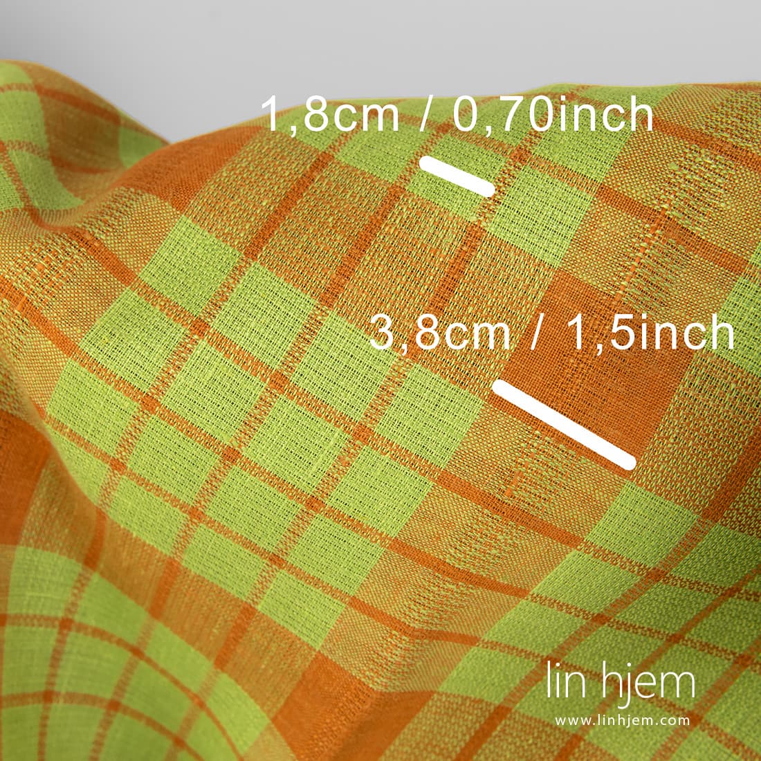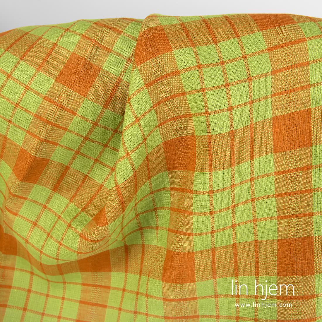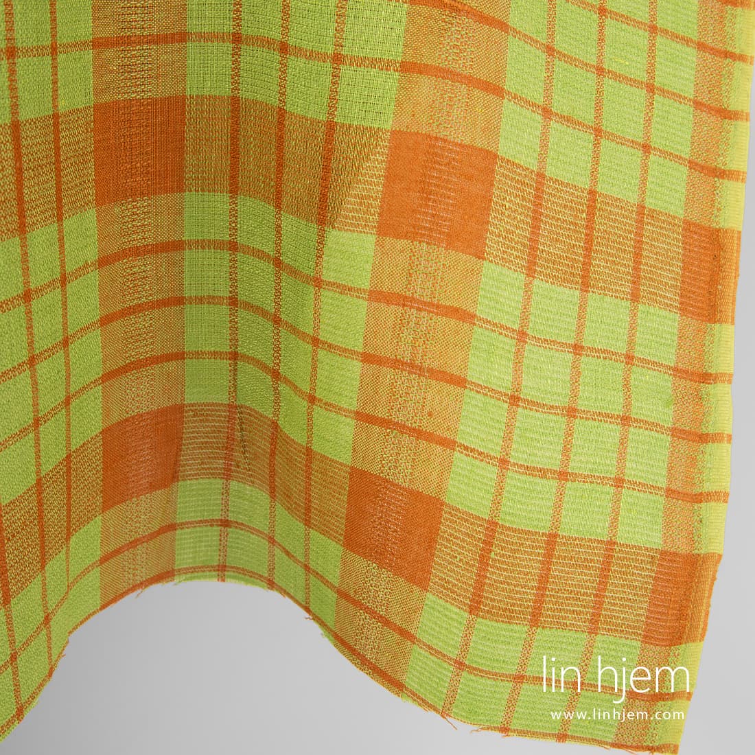 Linstoff i grønne og oransje ruter som er tettvevd, holdbart, middels tykkelse. Passer til å sy duker, servietter, forklær, gardiner.