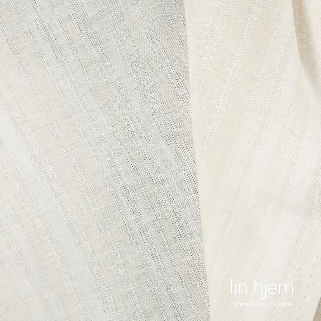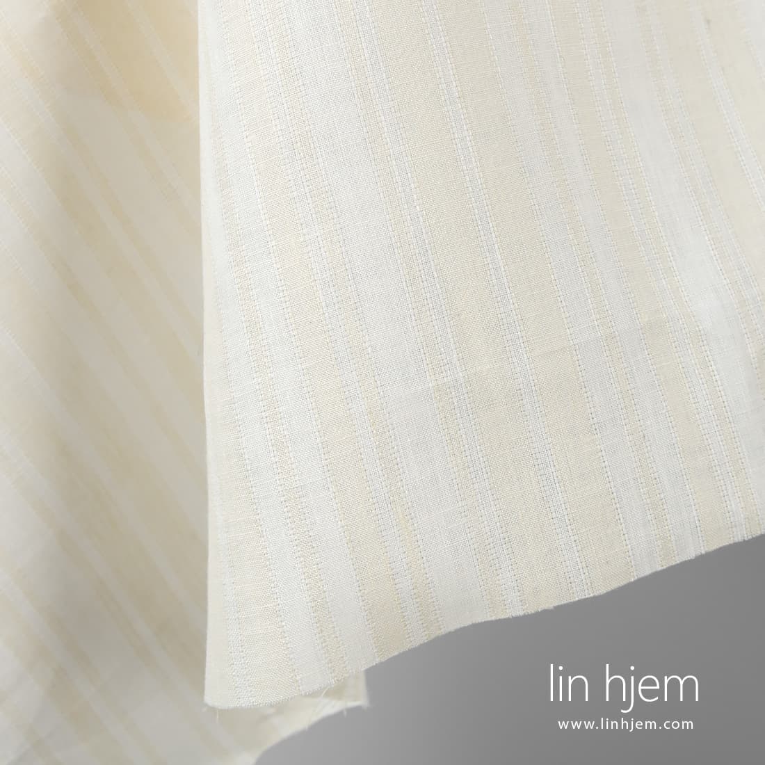 Linstoff i vertikale gulaktige, melkehvite og gjennomsiktige striper. Lett, tettvevd, middels tykkelse stoff som passer perfekt til å sy klær, duker, servietter, gardiner.