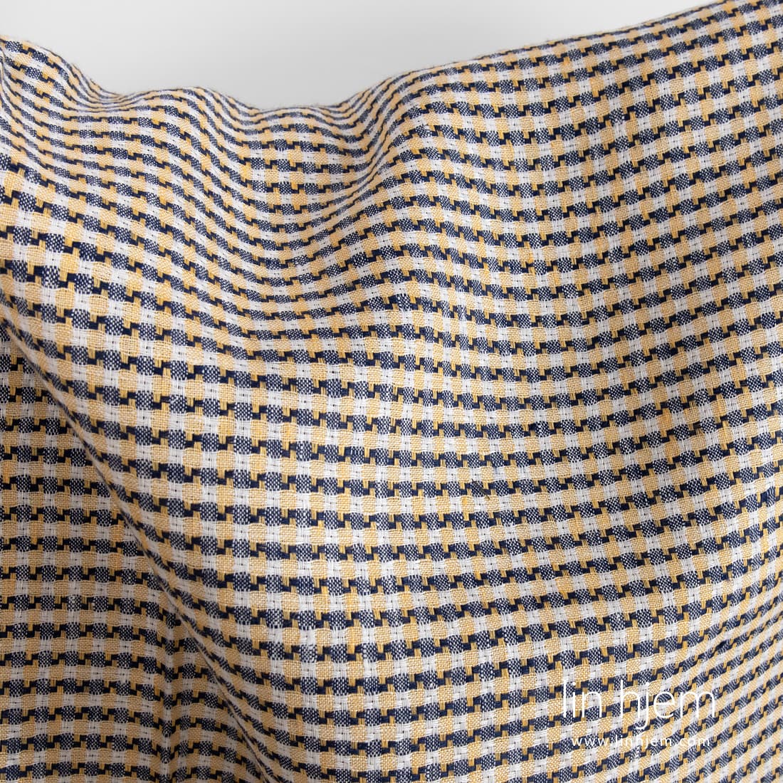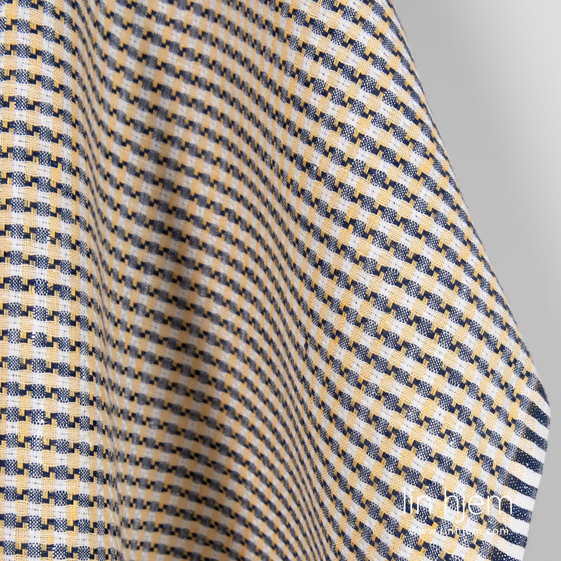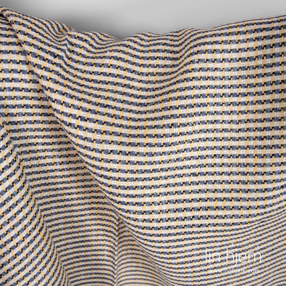 Linstoff i gule og blå ruter som er tettvevd, holdbart, av middels tykkelse. Passer best til å sy servietter, gardiner, duker, klær.