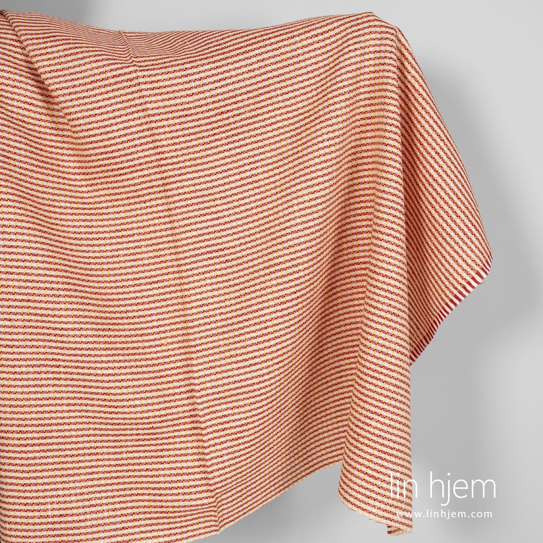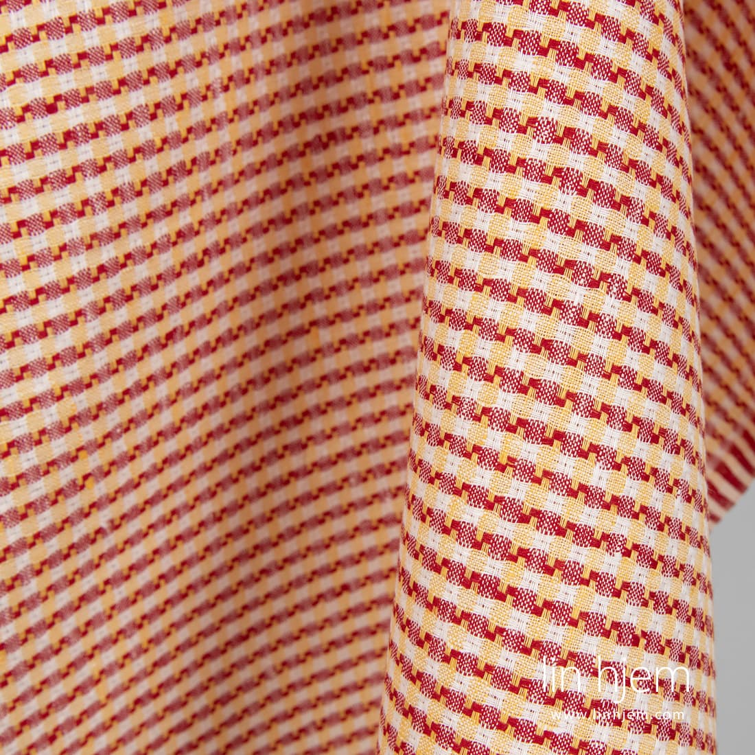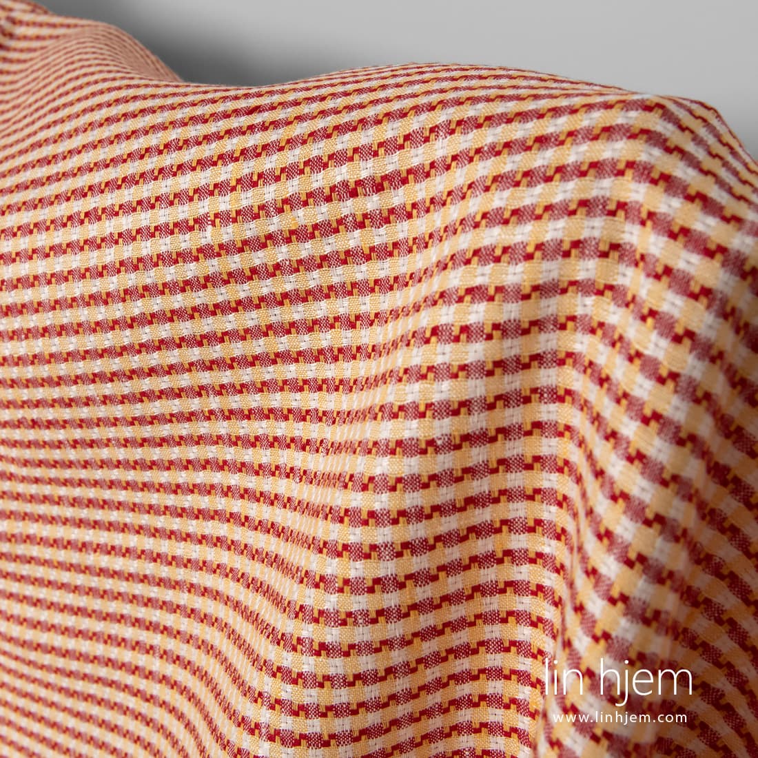 Linstoff i gule og røde ruter. Stoffet er holdbart, tettvevd, middels tykkelse. Sy klær, duker, servietter, gardiner av dette dekorative stoffet.