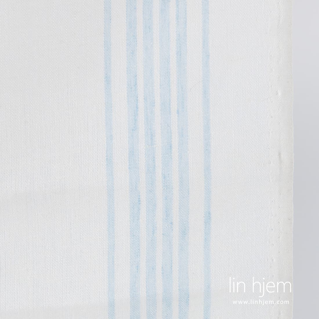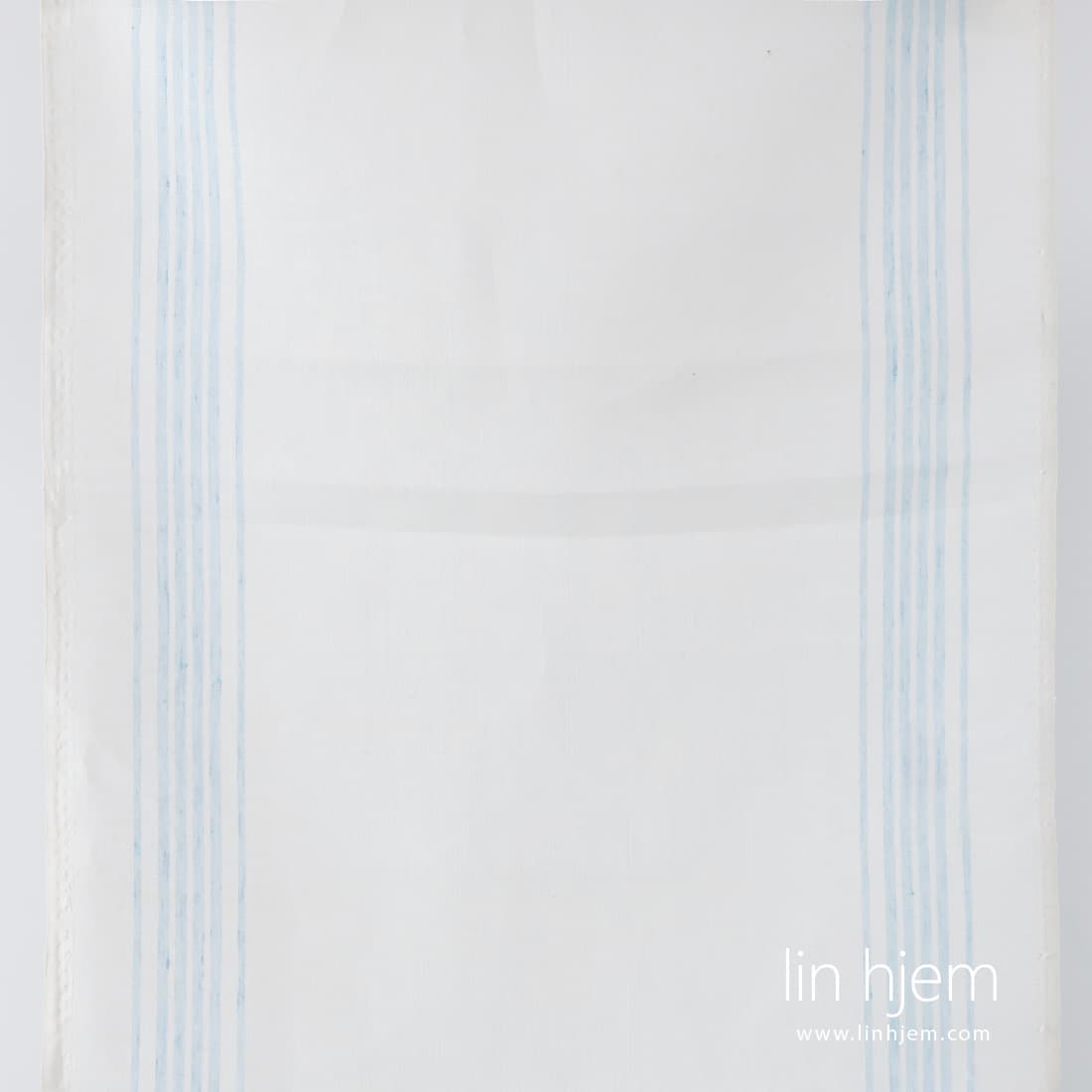 Linstoff i lyseblå striper på melkehvit bakgrunn. Tettvevd, holdbart, varig, godt absorberende. 50cm bredde passer perfekt til å sy kjøkkenhåndklær.