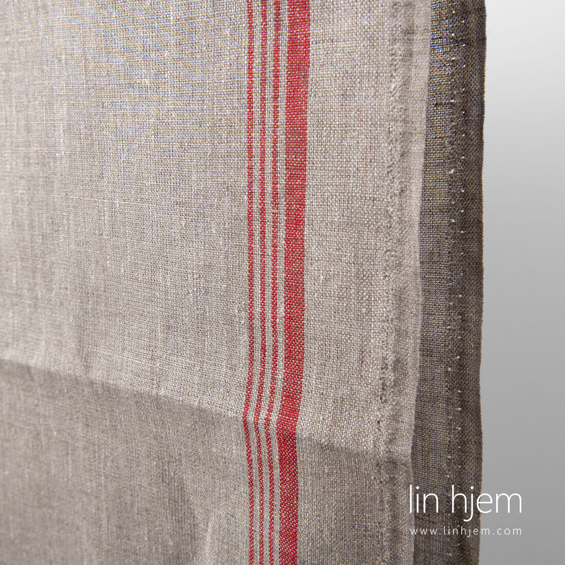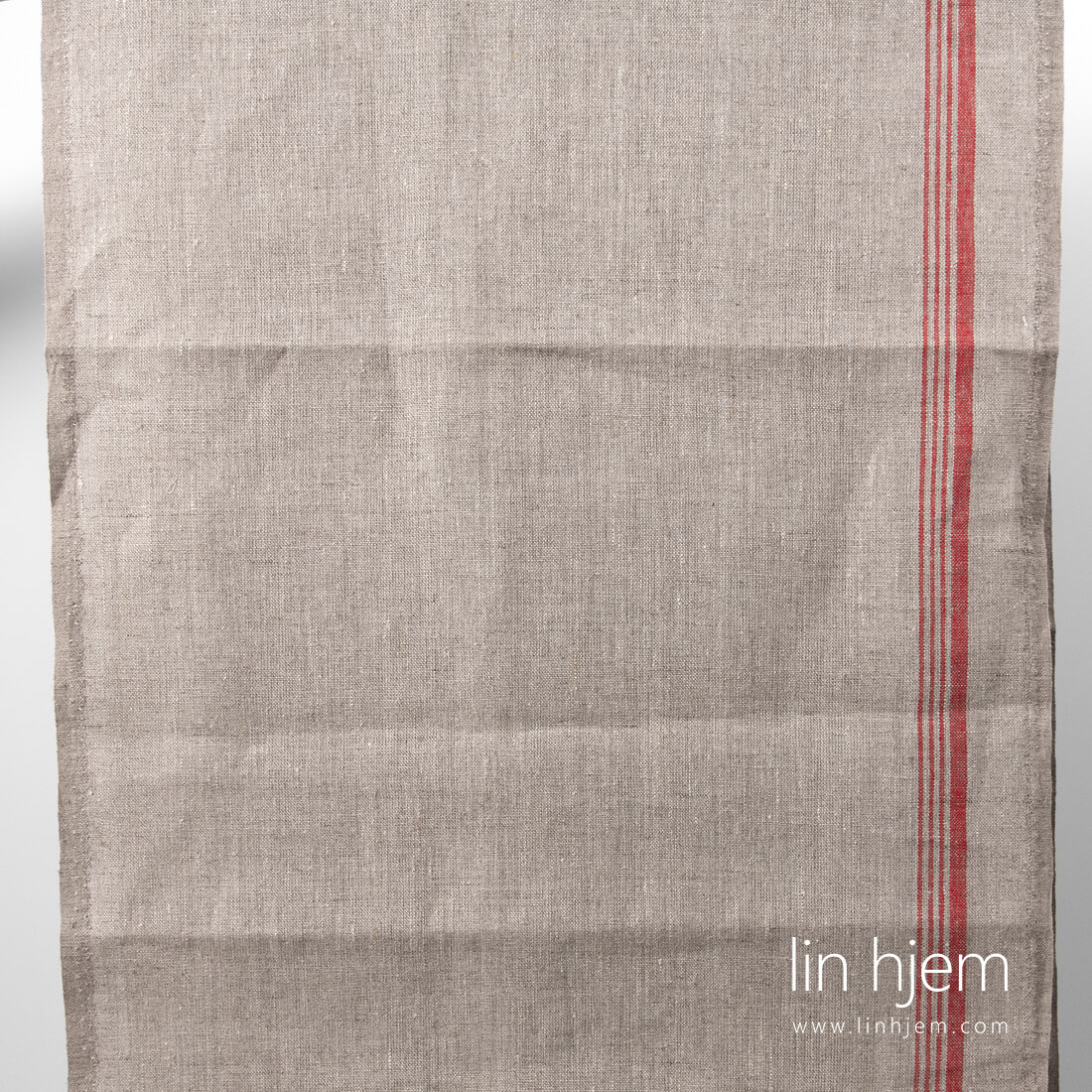 Linstoff i naturlig farge med røde striper på en kant. Vevd fra naturelle (ufarget) og røde 100% lin garn. Veldig tøft, tettvevd og middels tykkelse. Stoffet absorberer fuktighet veldig godt derfor passer perfekt til å sy kjøkkenhåndkle.