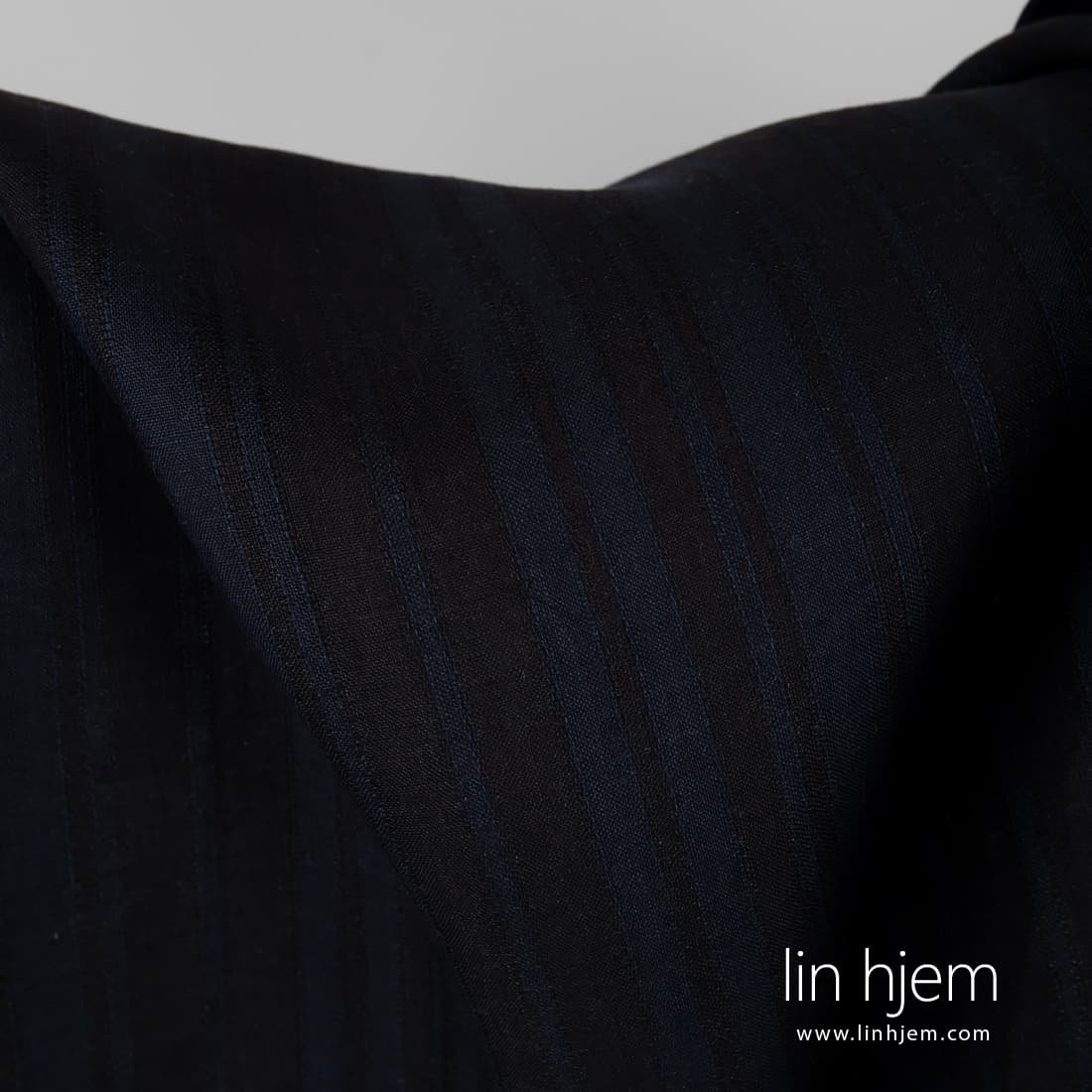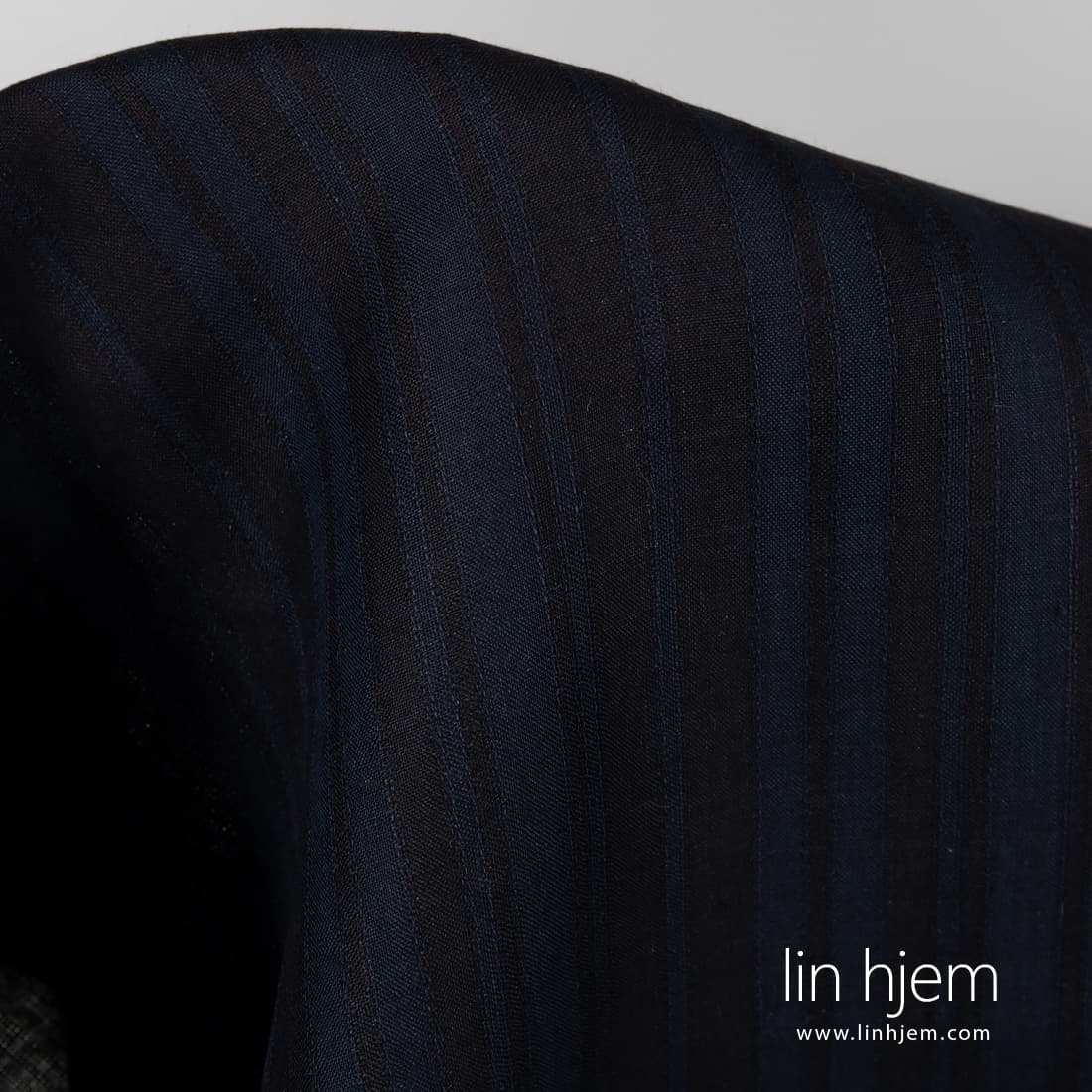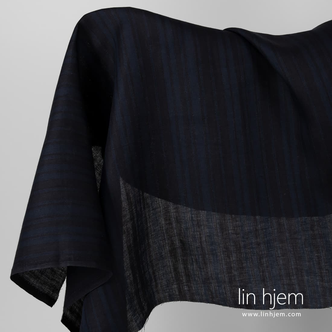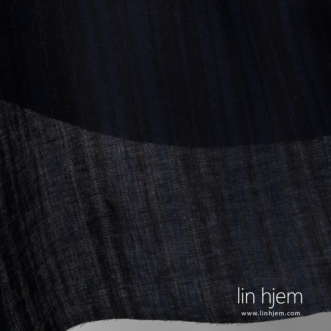 Linstoff i svarte og mørkeblå striper atskilt med vertikale gjennomsiktige striper. Sy klær, gardiner, duker av dette linstoffet.