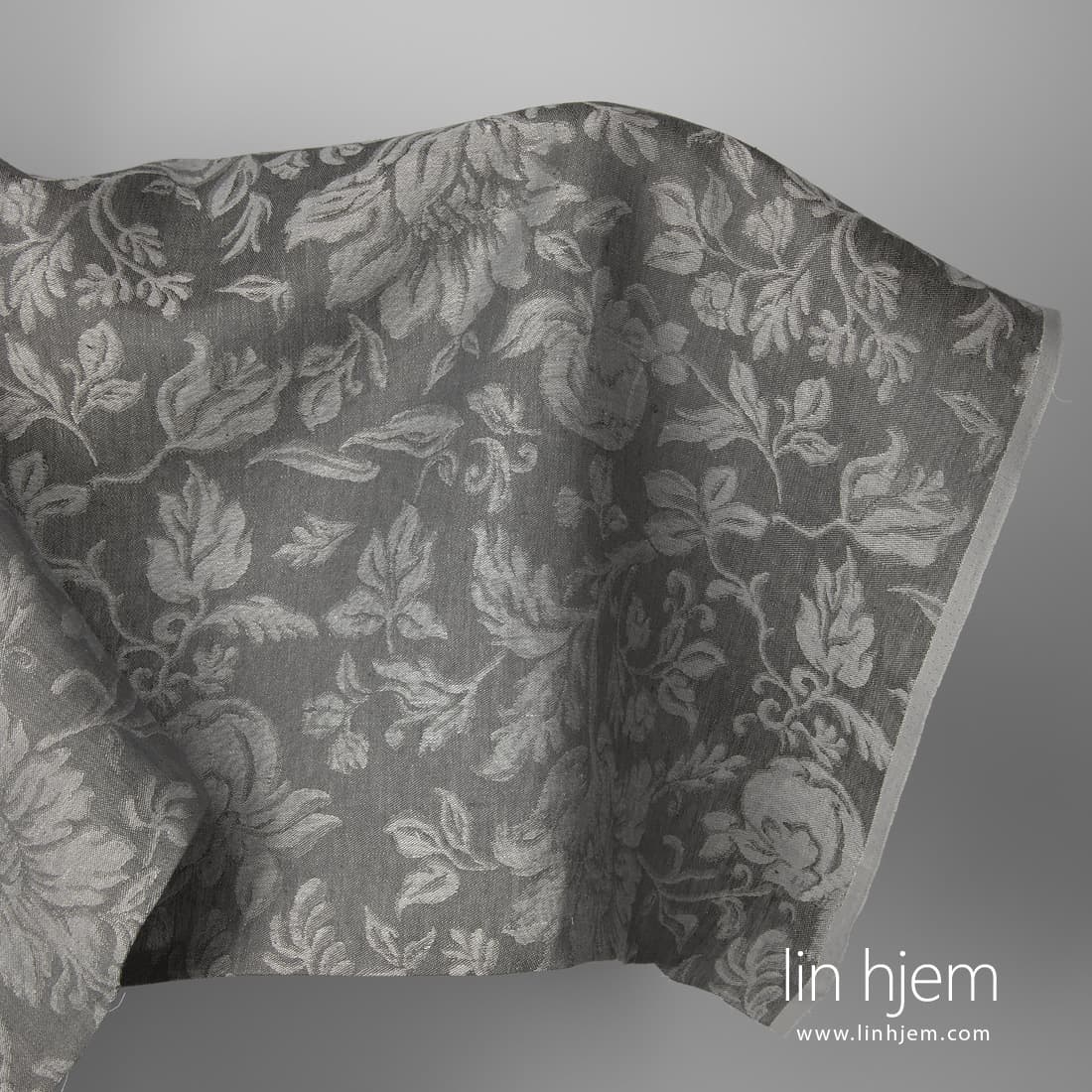 • Linstoff jacquard med blomster vevd av mørkegrått og blågrått garn