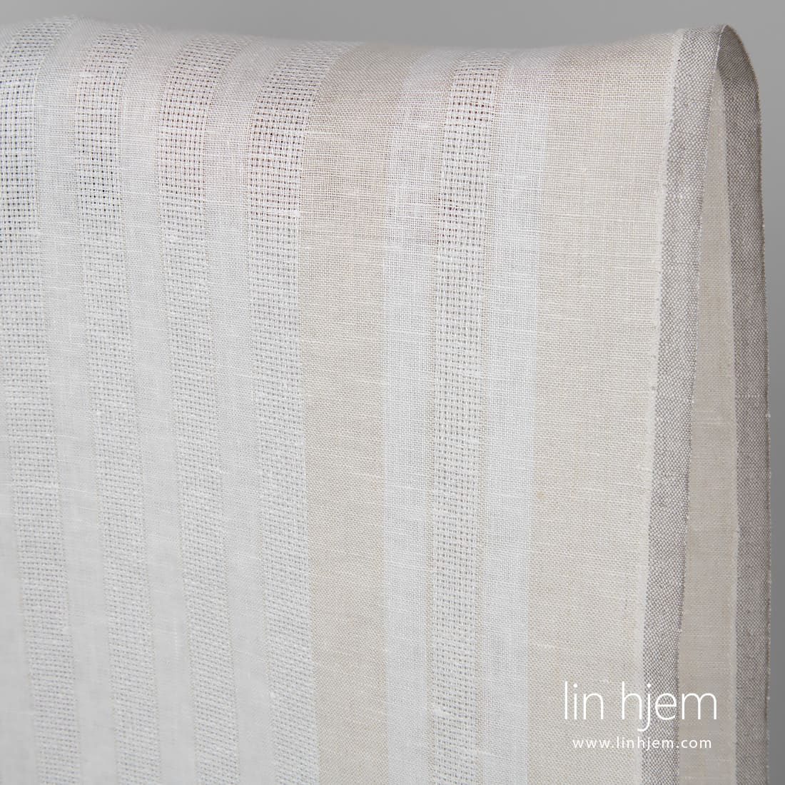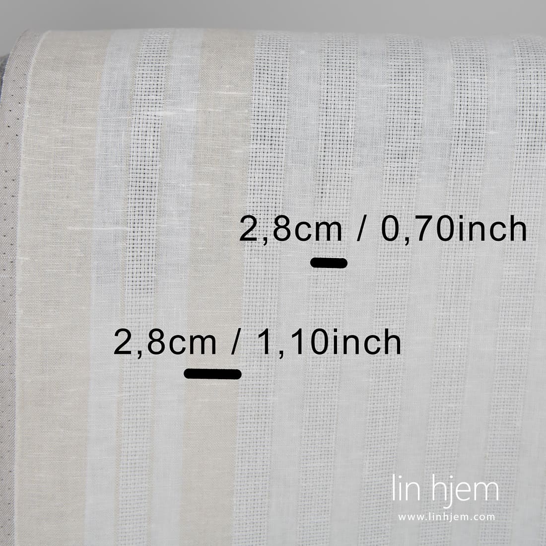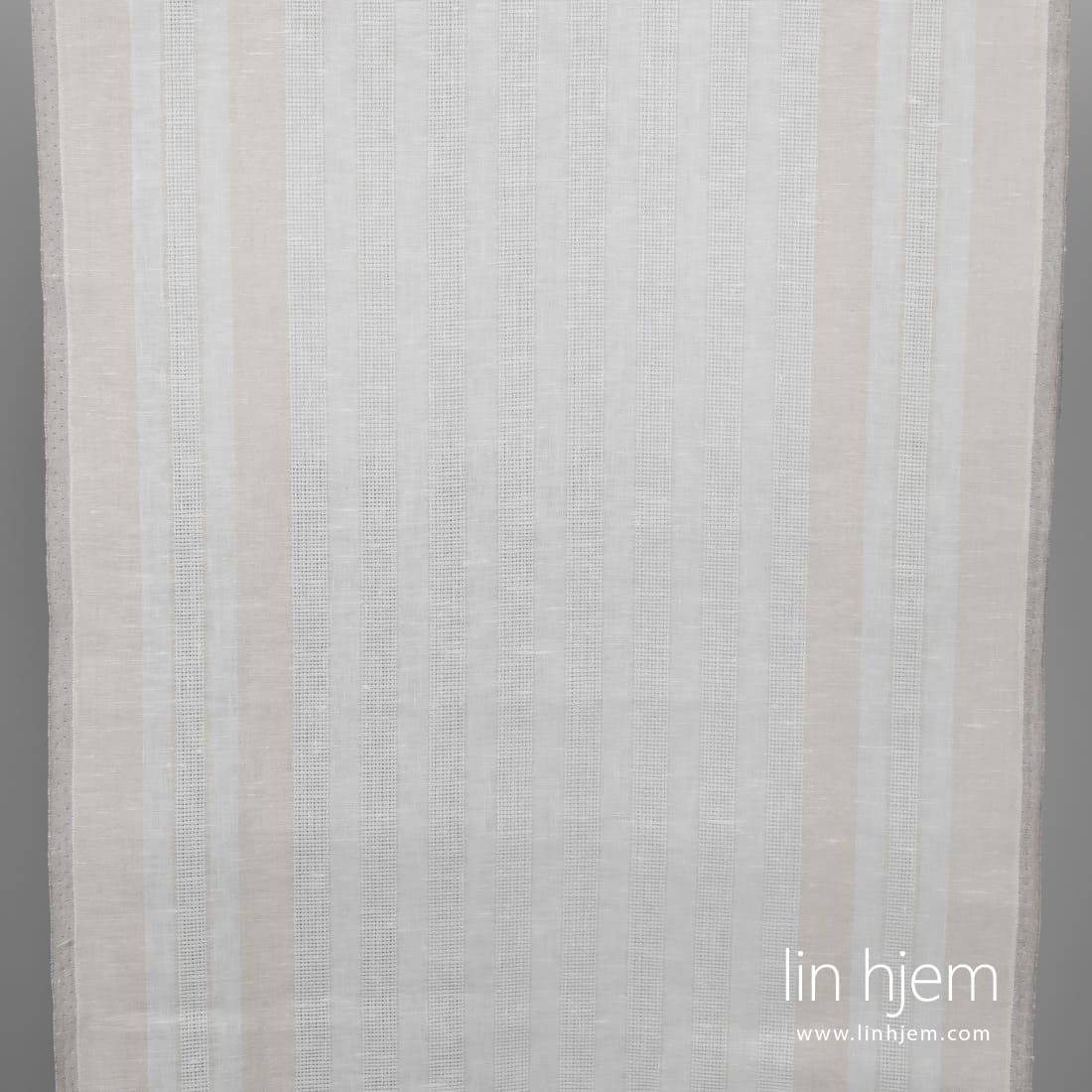 Linstoff med gjennomsiktige vertikale striper av melkehvite og naturlig(ufarget) garn. Dette linstoffet av middels tykkelse absorberer fuktighet godt derfor passer perfekt til å sy kjøkkenhåndklær.