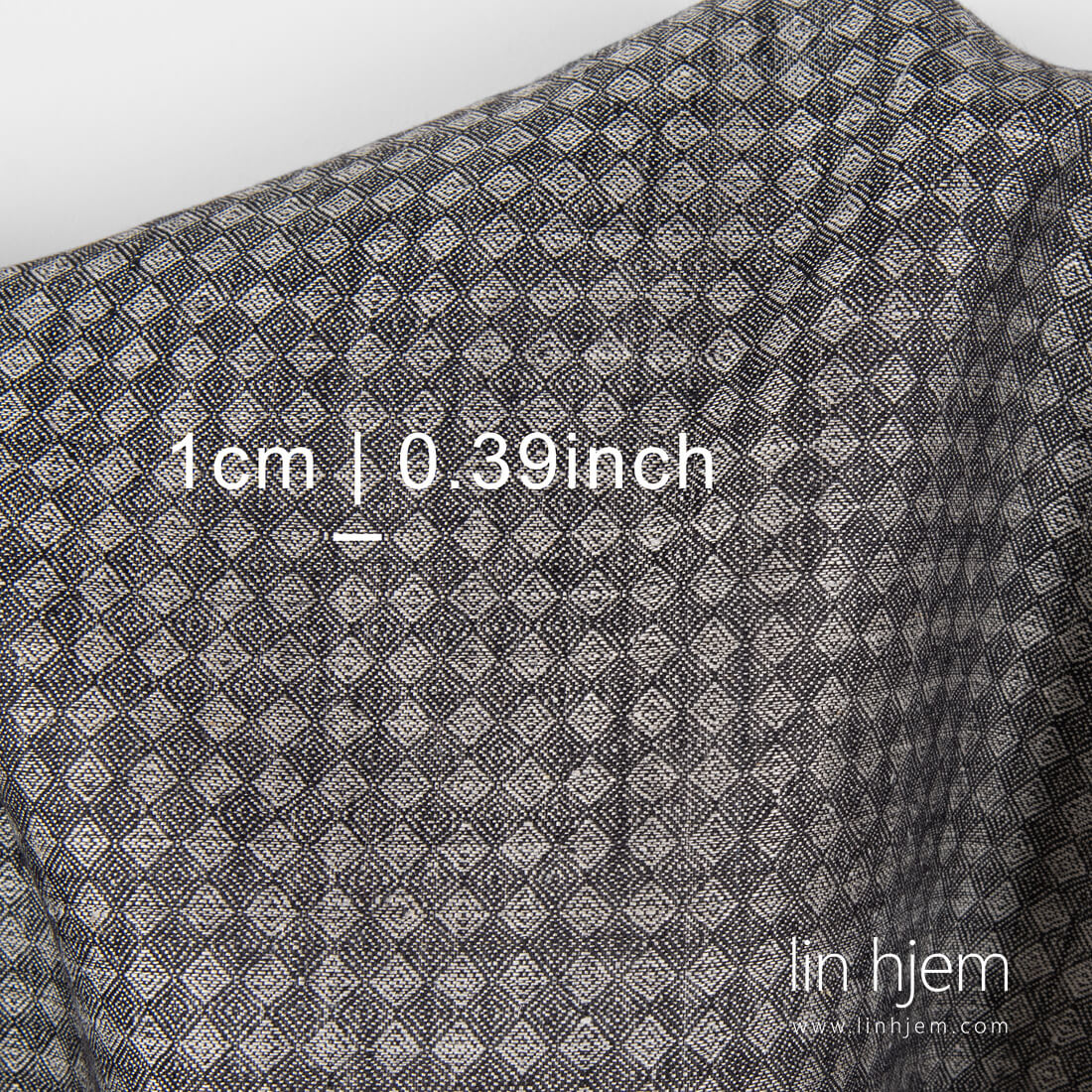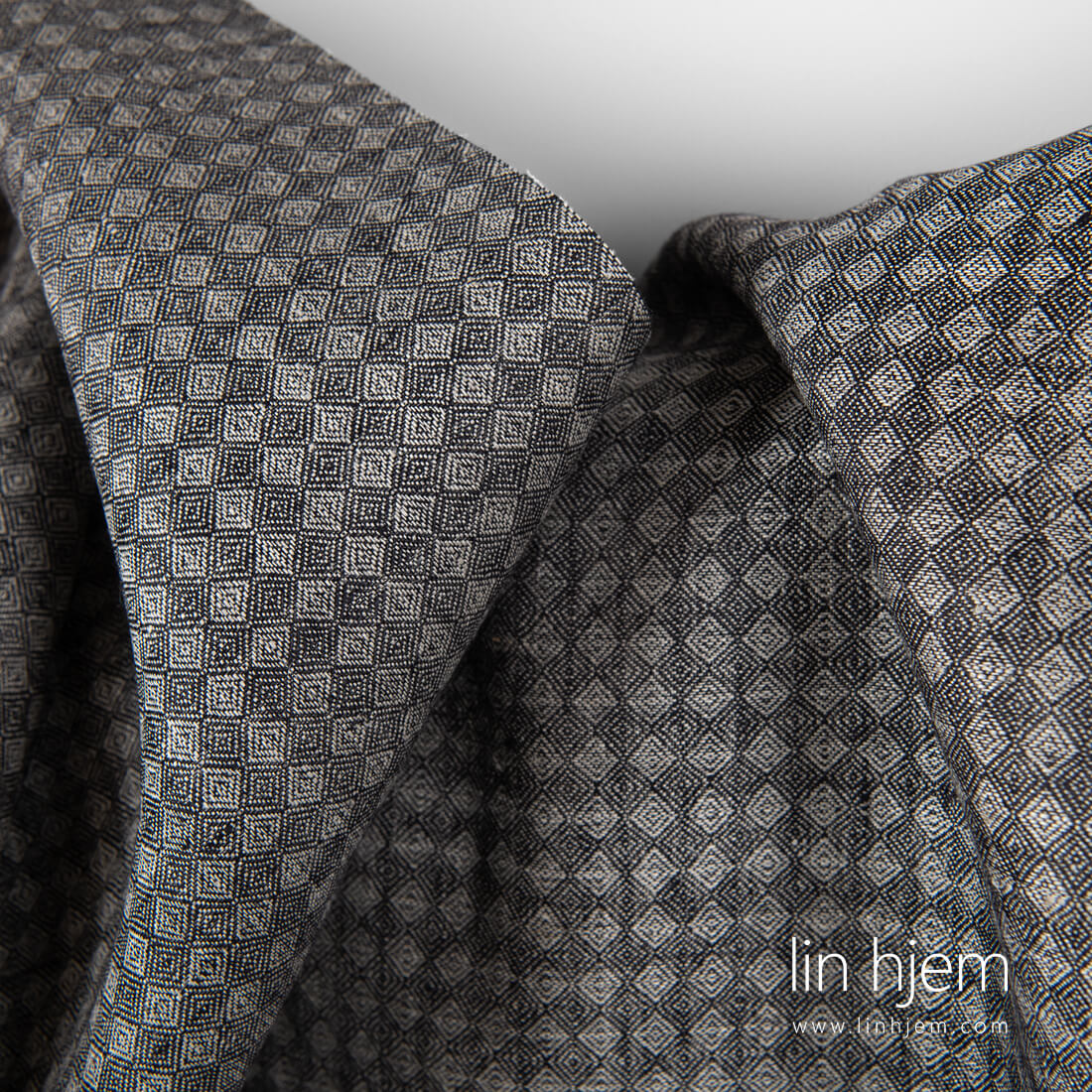 Linstoff med gråsvarte romber. Grå romber ble vevd fra naturelle(ufarget) brunaktige garn. Stoffet er tøft, tettvevd, middels tykkelse og subtilt dekorativt. Passer til å sy klær, putetrekk, forklær og spisebord produkter.