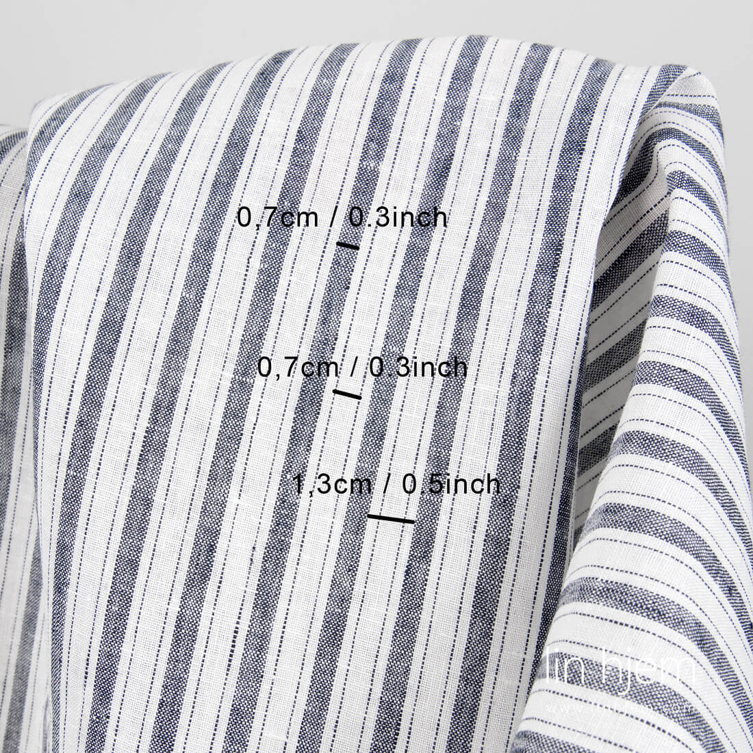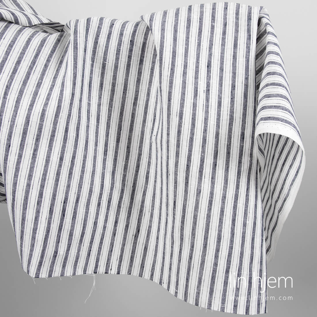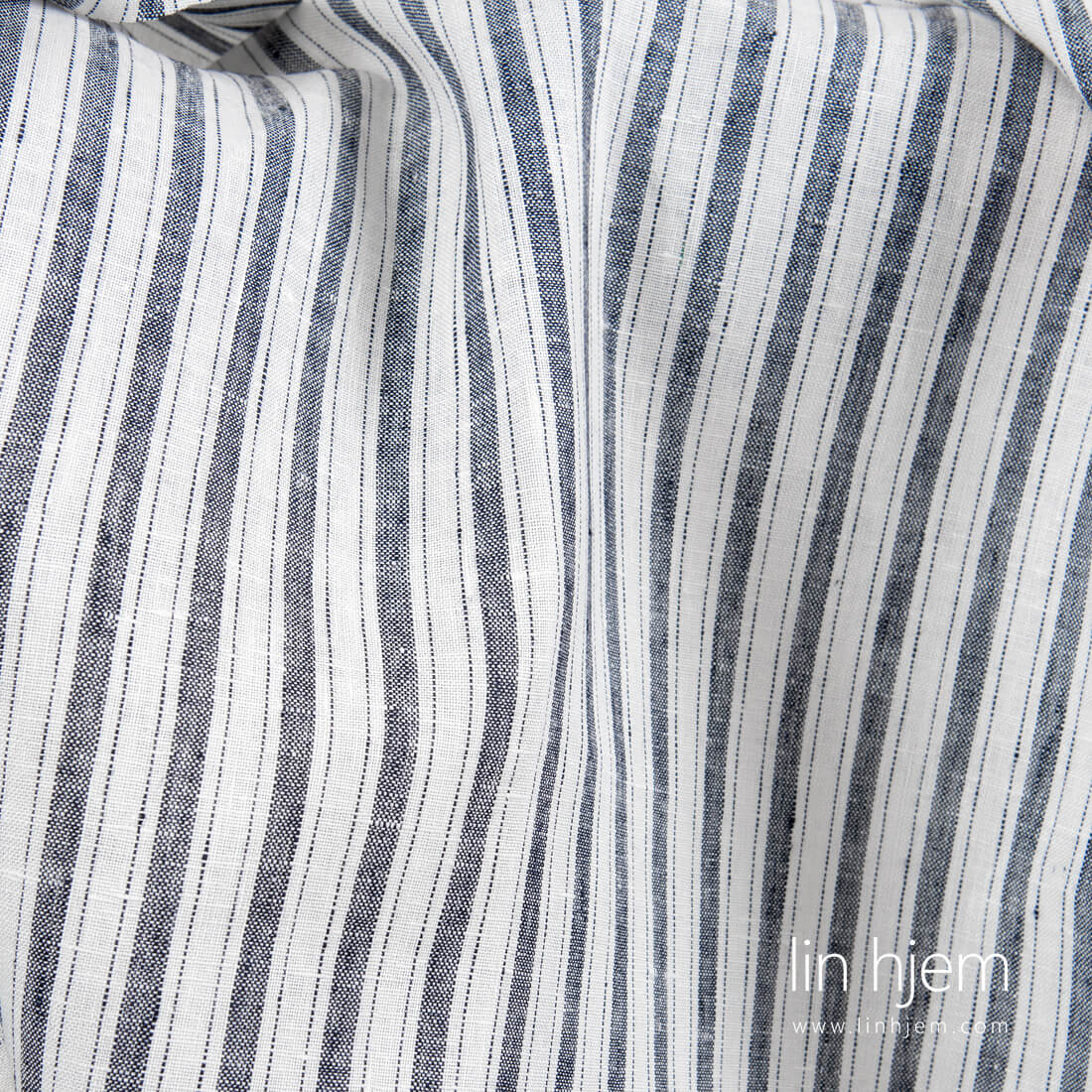 Linstoff med mørkeblå striper i melkehvit bakgrunn. Stoffet er tettvevd, middels tykkelse og veldig holdbart. Passer perfekt til hjem tekstil og til å sy klær. 130cm bredde.