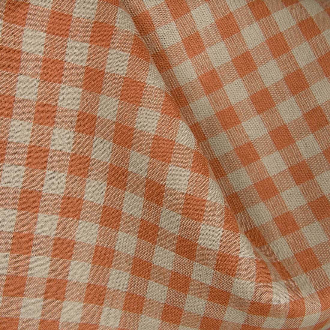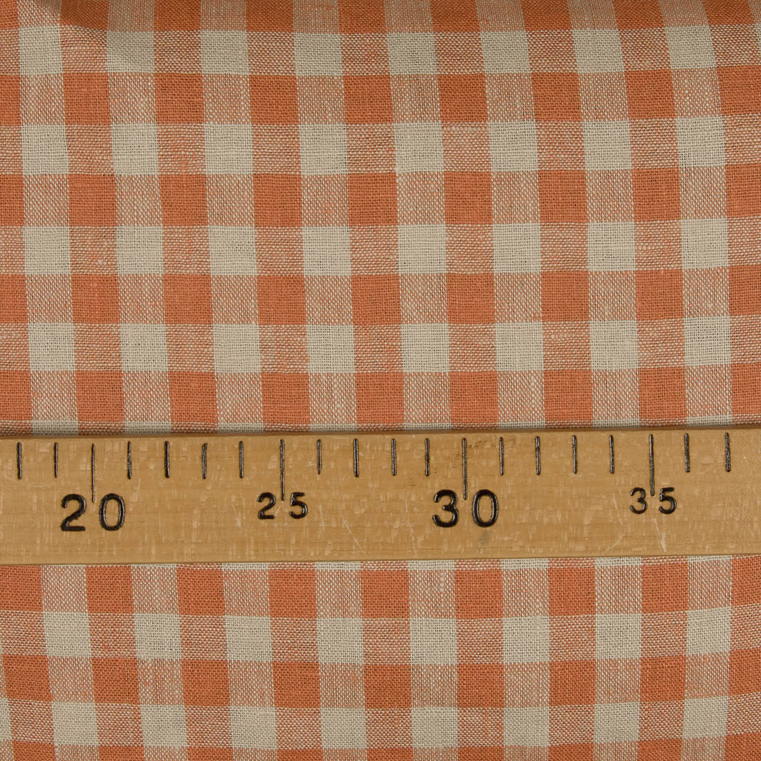 Linstoff med oransje og grå ruter som er veldig holdbart, tettvevd og av middels tykkelse. Størrelse av en rute: 1,3cm x 1,3cm.