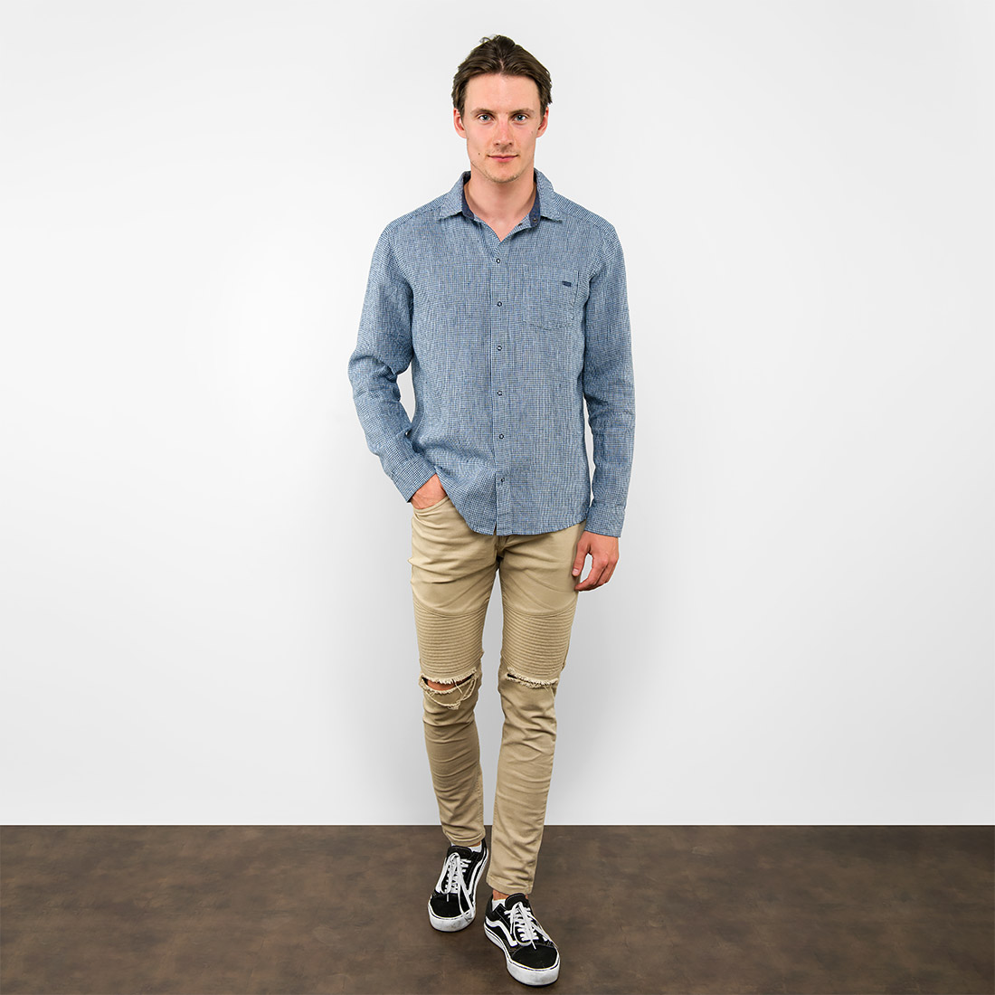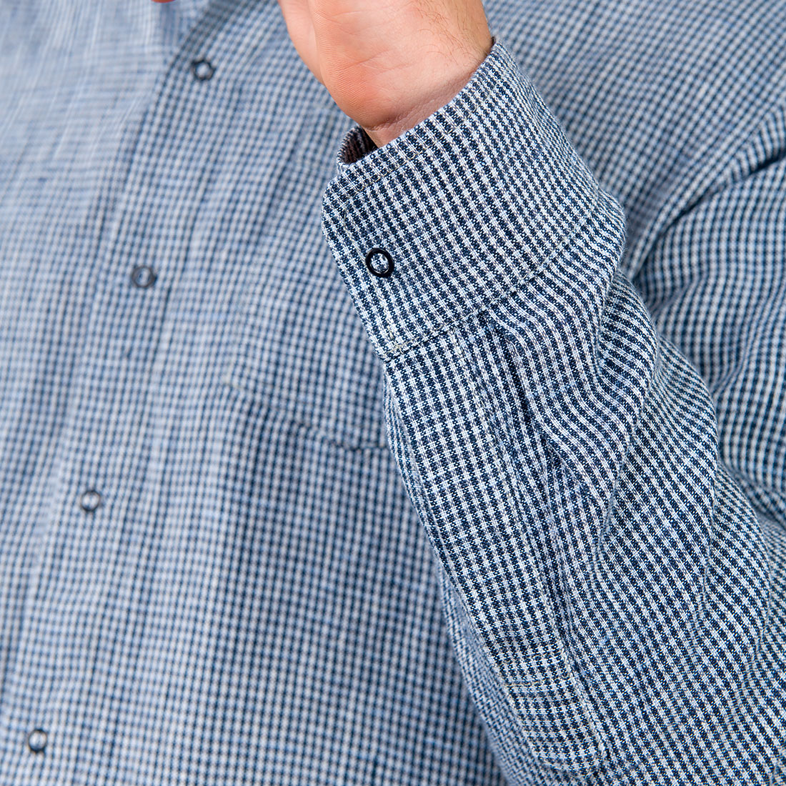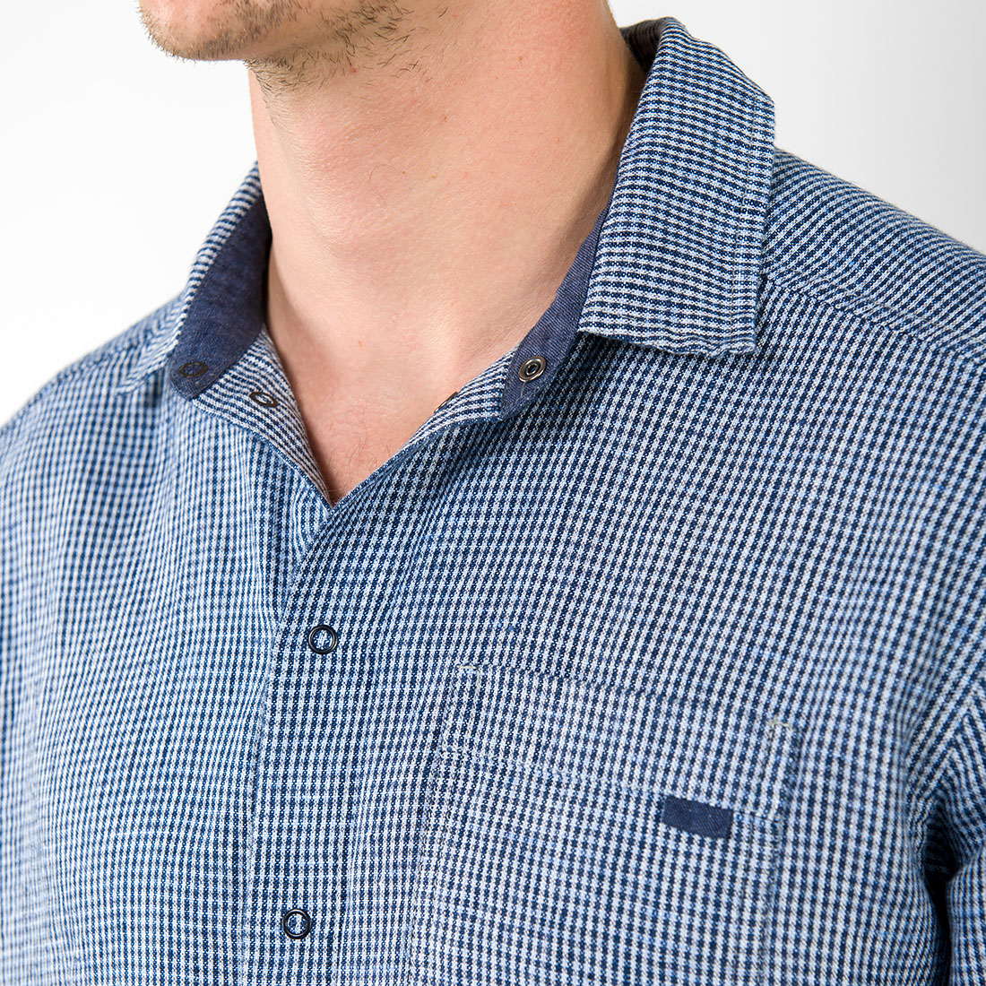 - Detaljer: smal oppreist krage, trykknapper, lomme på venstre side, lange ermer
