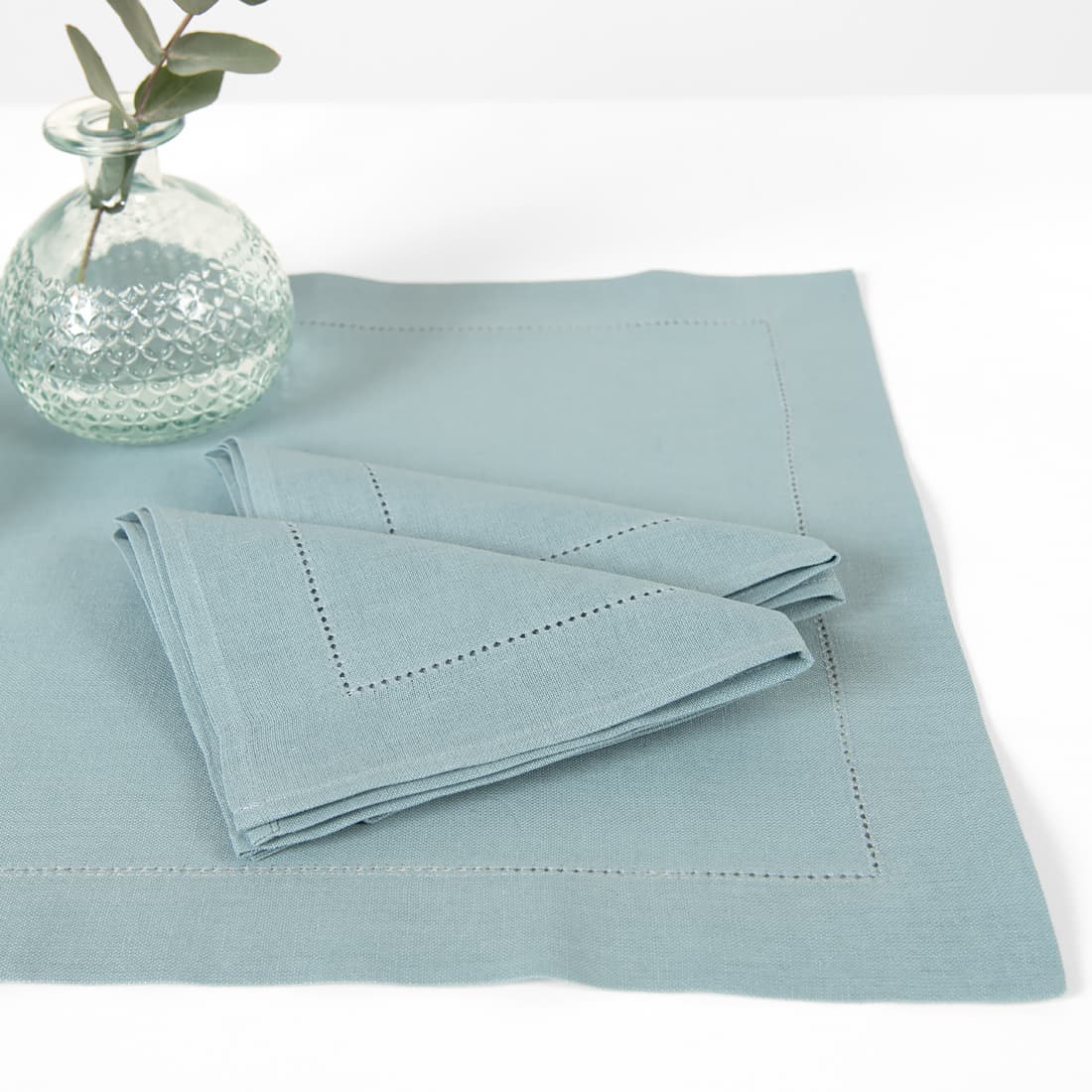 • Lin-bomull dekkebrikke grønnaktig med 4cm brettet kant og hullmønster