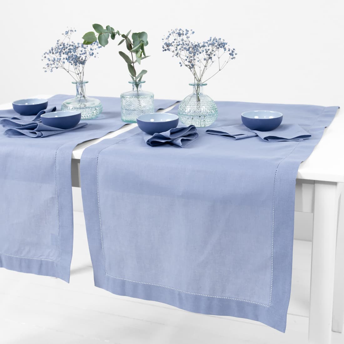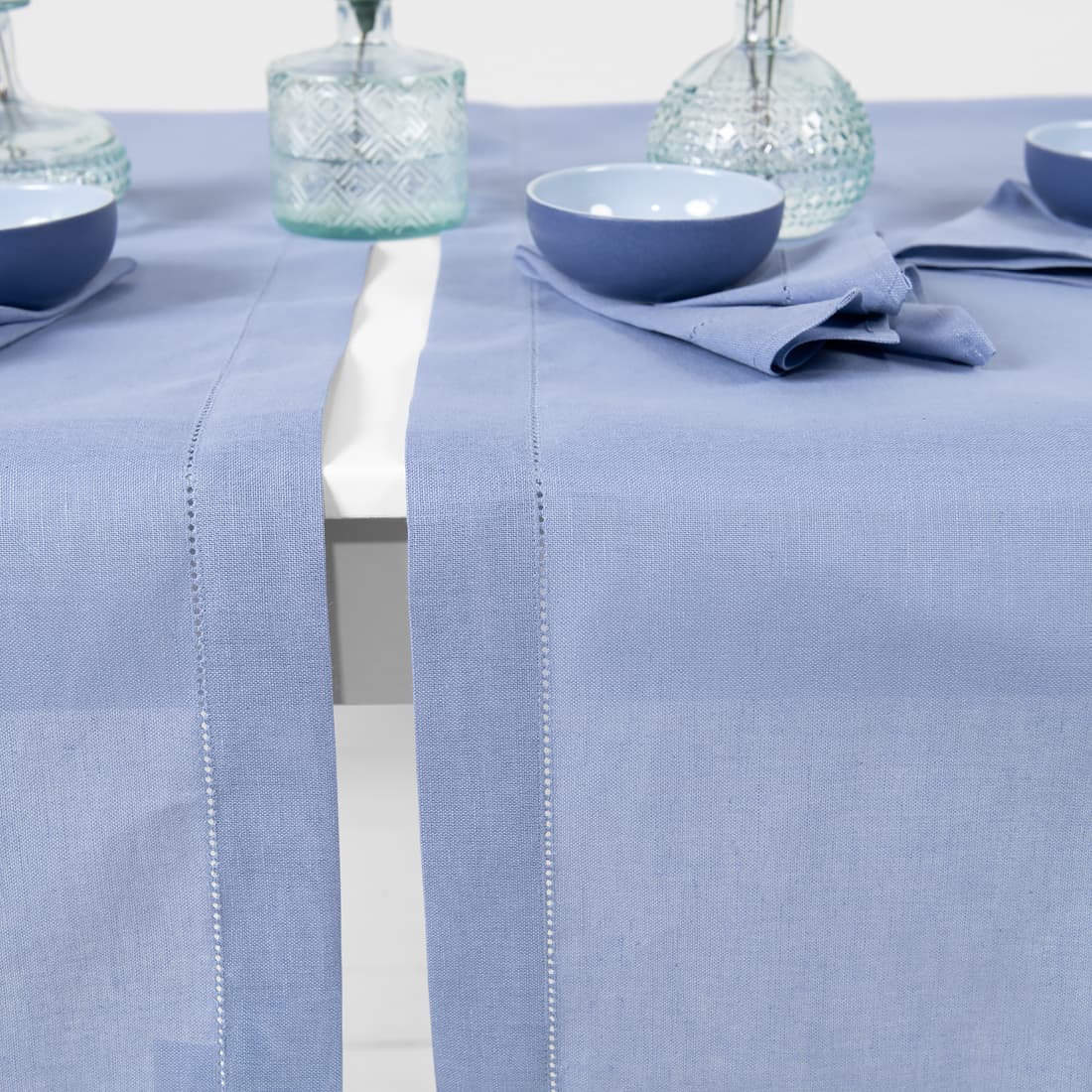 • Lin-bomull himmelblå bordløper med 4cm brettet kant og hullmønster
