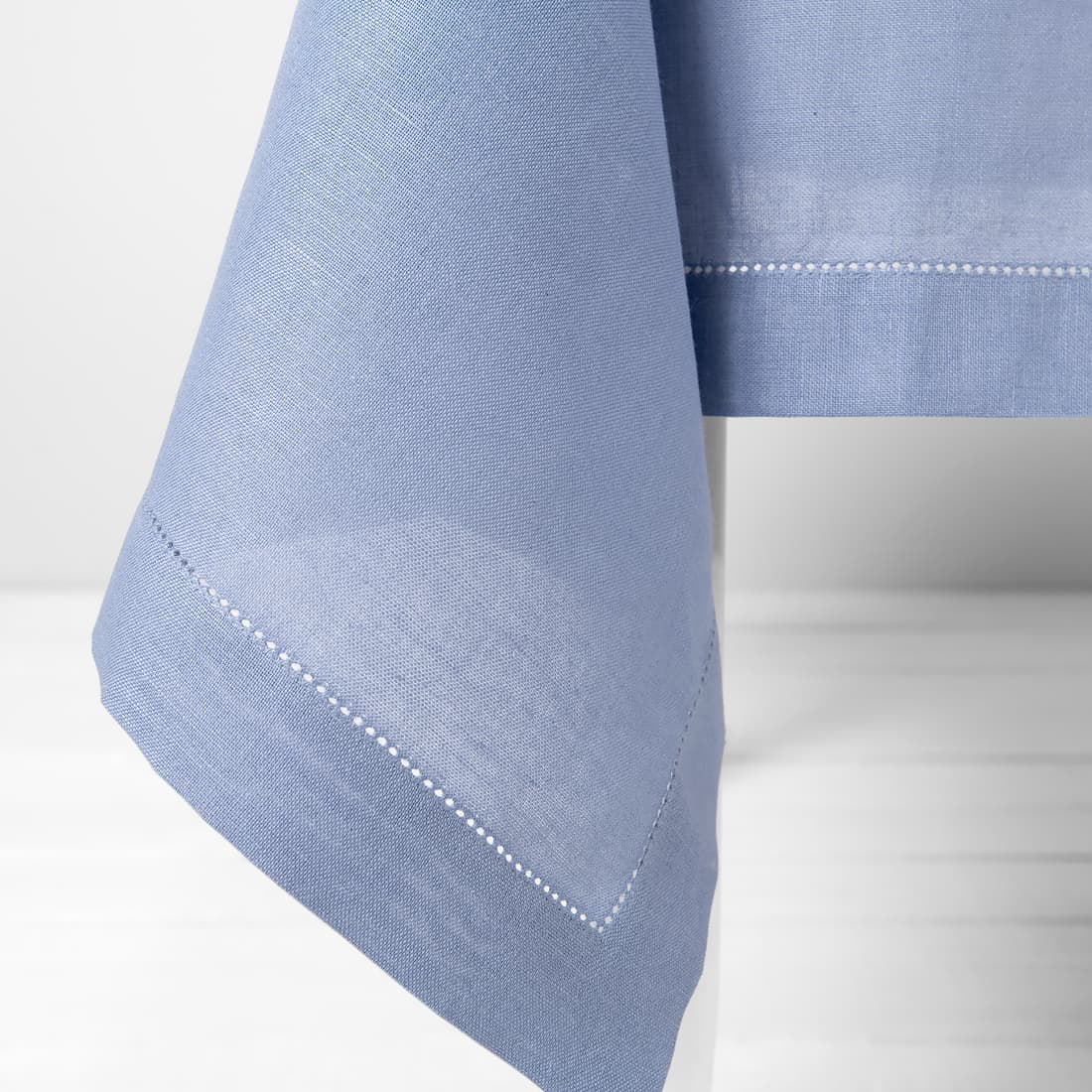 • Halvlin himmelblå duk med 4cm brettet kant og hullmønster