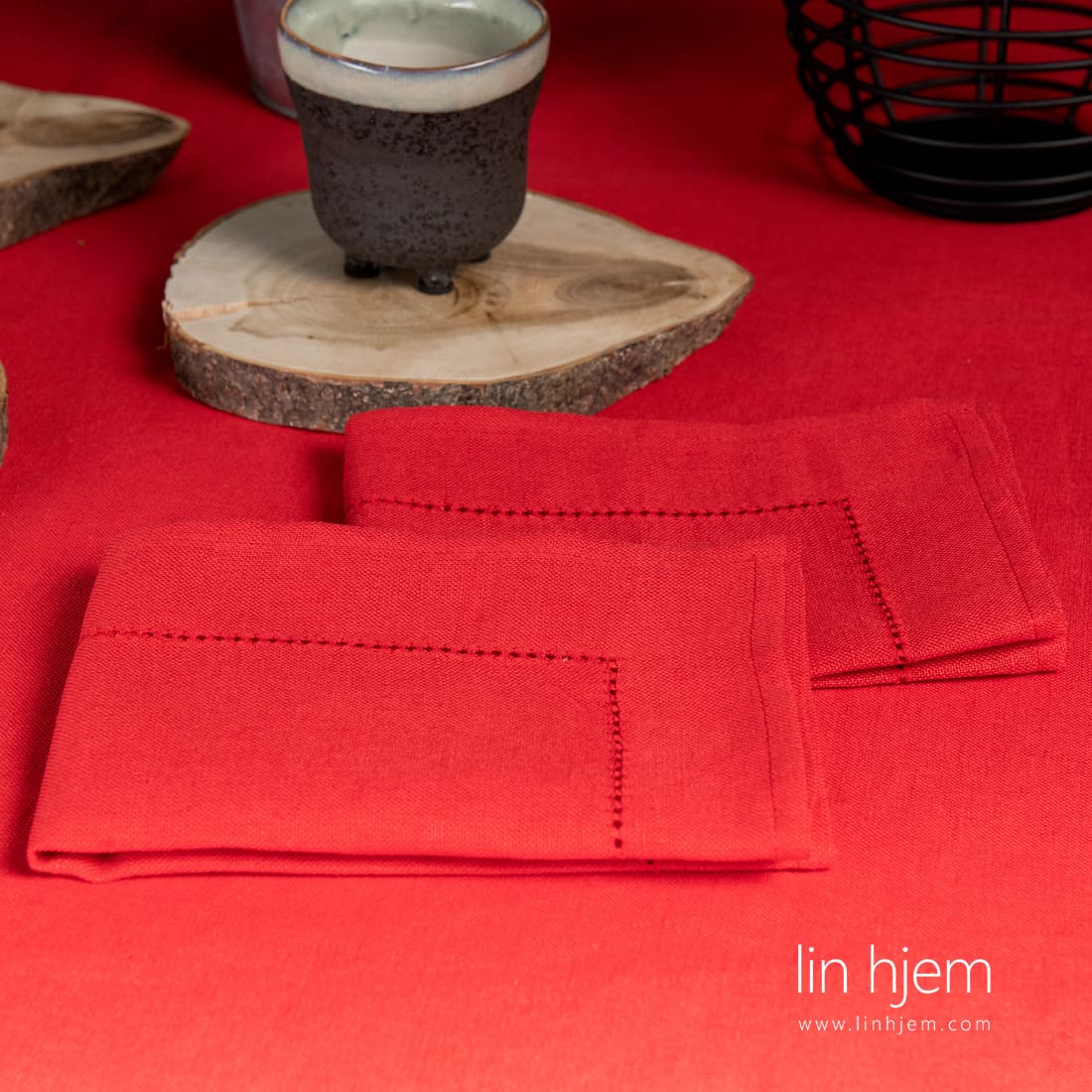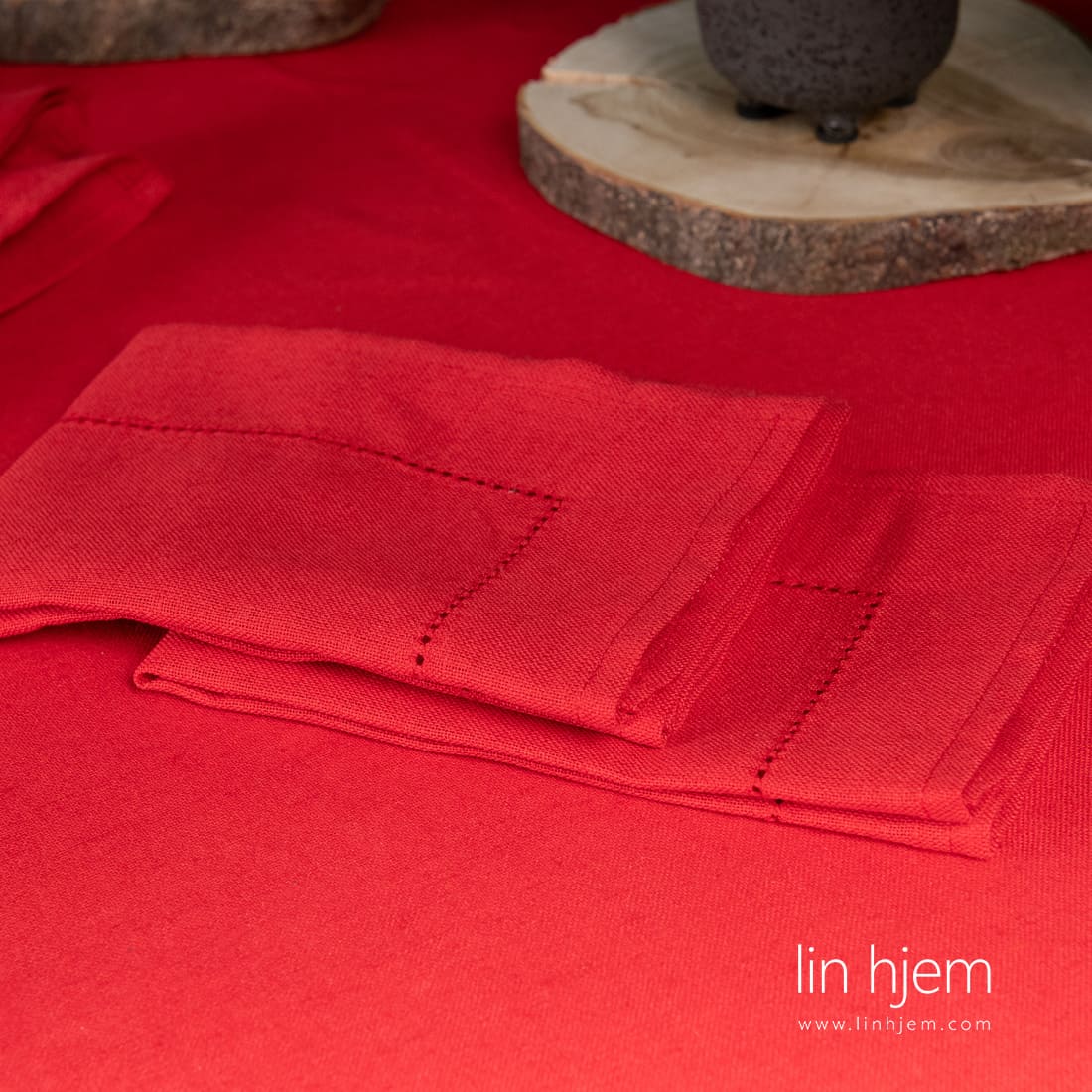 Rød hullmønstret serviett av lin. Festlig linserviett både til spesielle anledninger og hverdag.