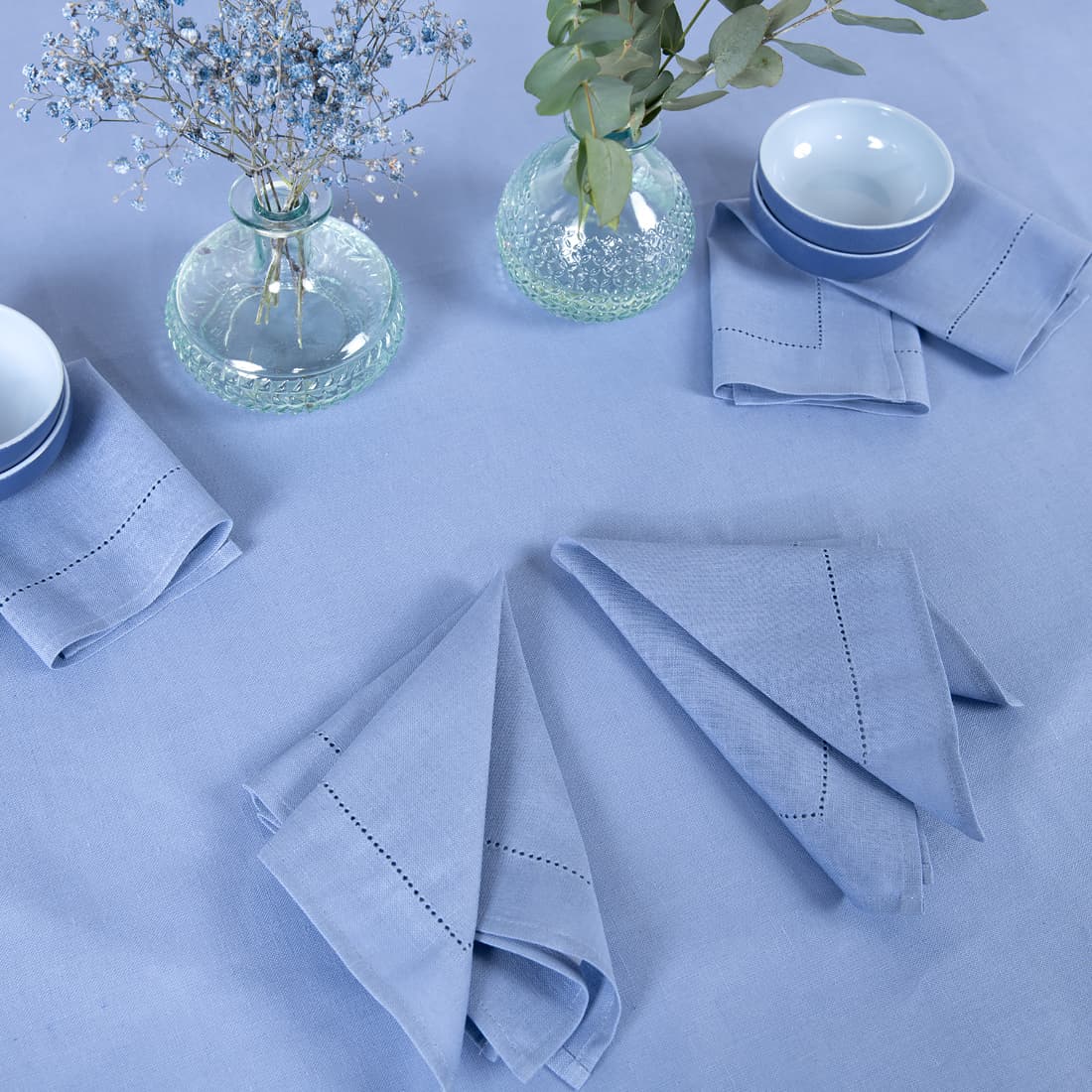 • LUNA rund (oval) himmelblå lin-bomull duk med hullmønster og matchende servietter