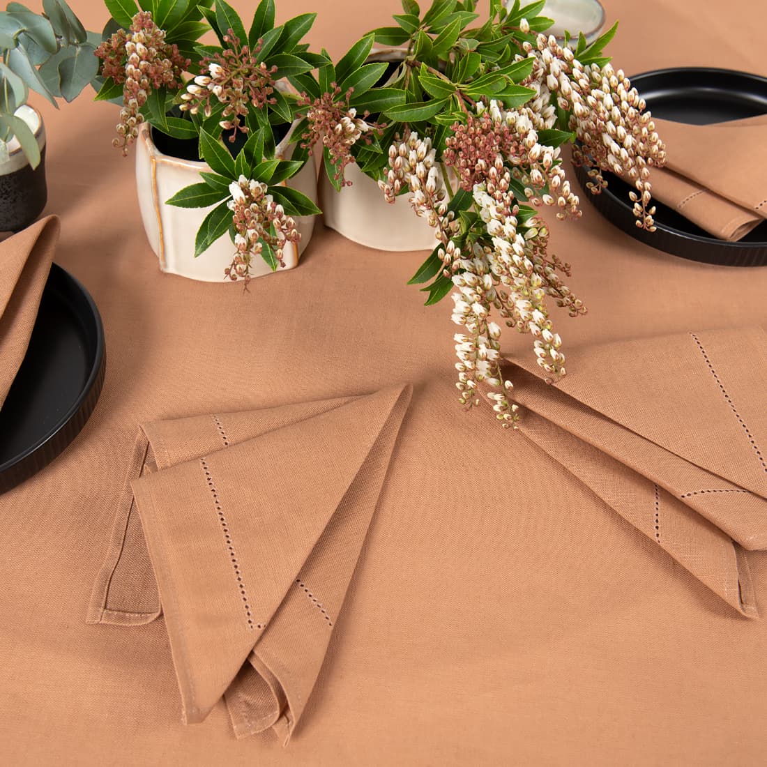 • LUNA rund (oval) lysebrun lin-bomull duk med hullmønster og matchende servietter