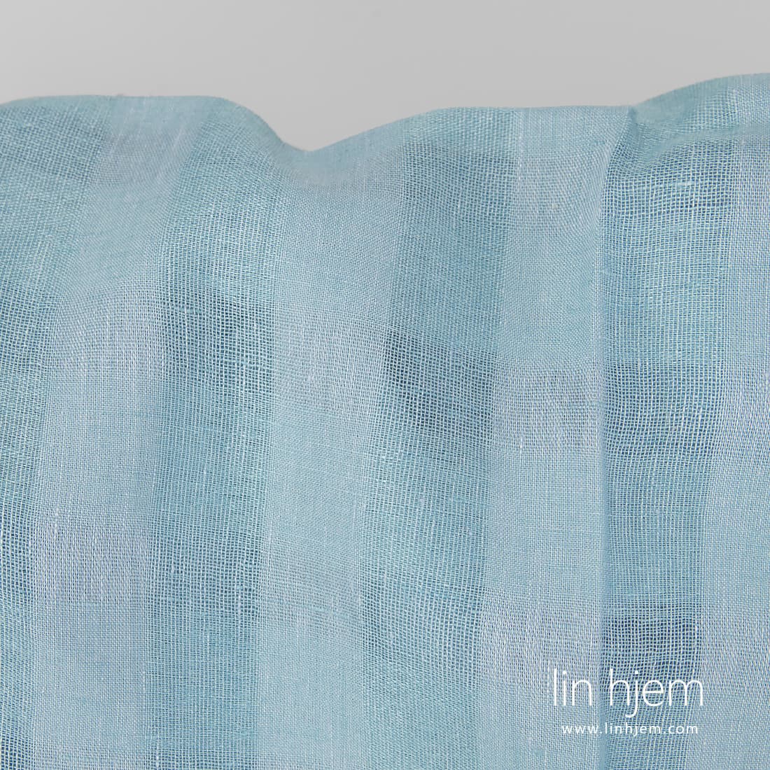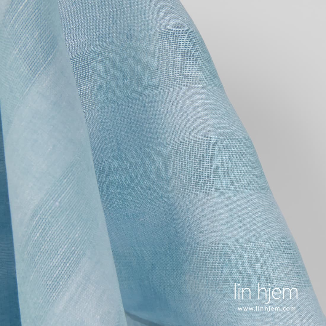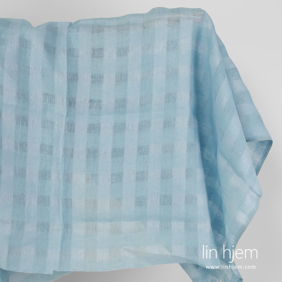 Lyseblått gjennomsiktig linstoff i ruter vevd i løstvevde, tettere ruter. Dette stoffet ble vevd av lyseblå og lys turkis garn. Passer til å sy gardiner, skjerf, sjal.