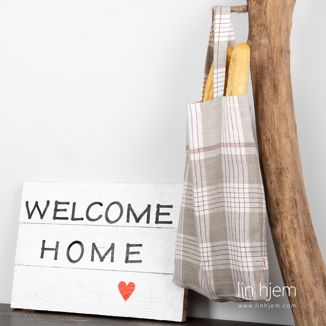 Veske av lin med grå og røde ruter. Rutene ble vevd av melkehvite, mørkegrå, brune og naturlig(ufarget) lingarn. 40cm langt håndtak. Miljøvennlig veske av lin som er veldig holdbar og varig.