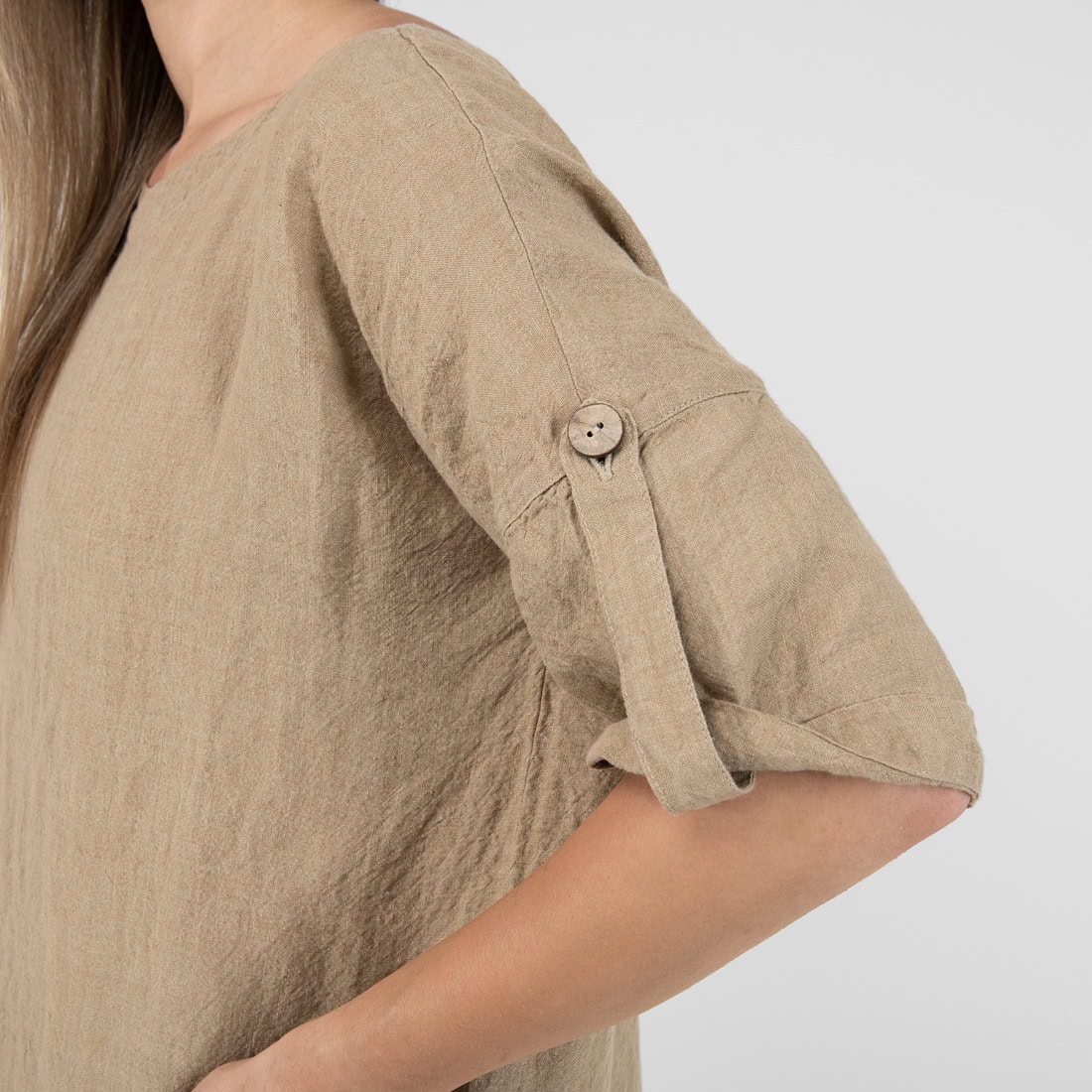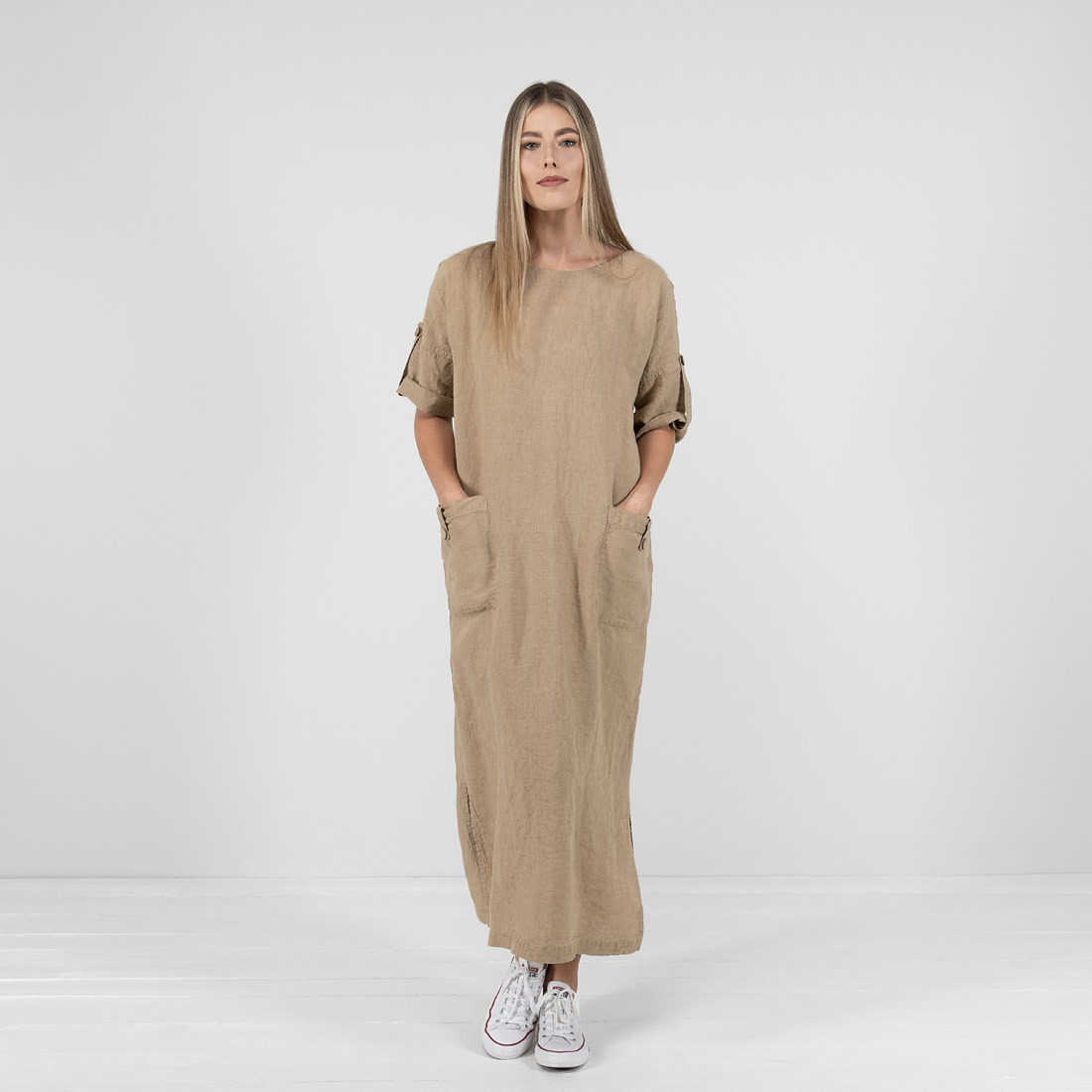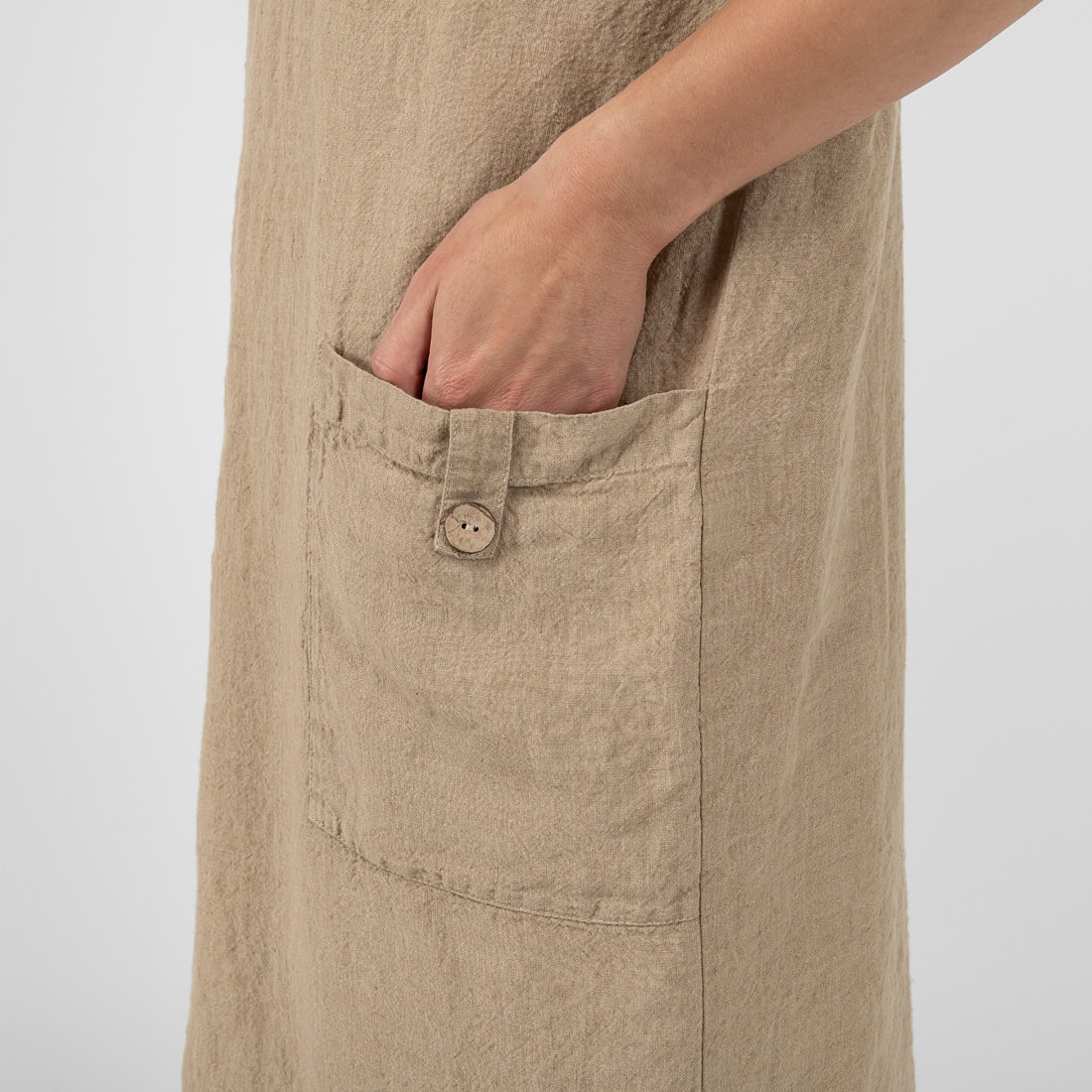 - Detaljer: rund halsutringning, store lommer foran dekorert med striper og knapper, albuelange ermer med påsydde stropper, lukkes med knapper bak, V-utringning bak, sideslissene
