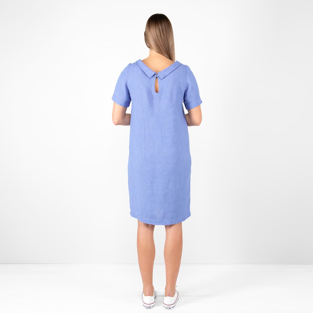 - Detaljer: korte ermer, rund halsutringning med reverskrage, lommer i skråsømmene foran, vid V-hals og nøkkelhullsutringning med knapp bak, glidelås