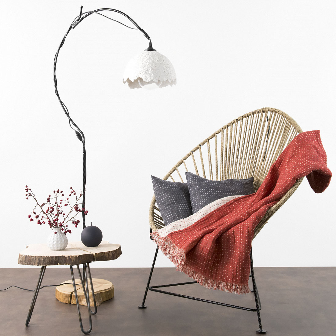 - Farge: vevd vanilje (gulaktig), lys krem, granatrødt og teglrødt garn