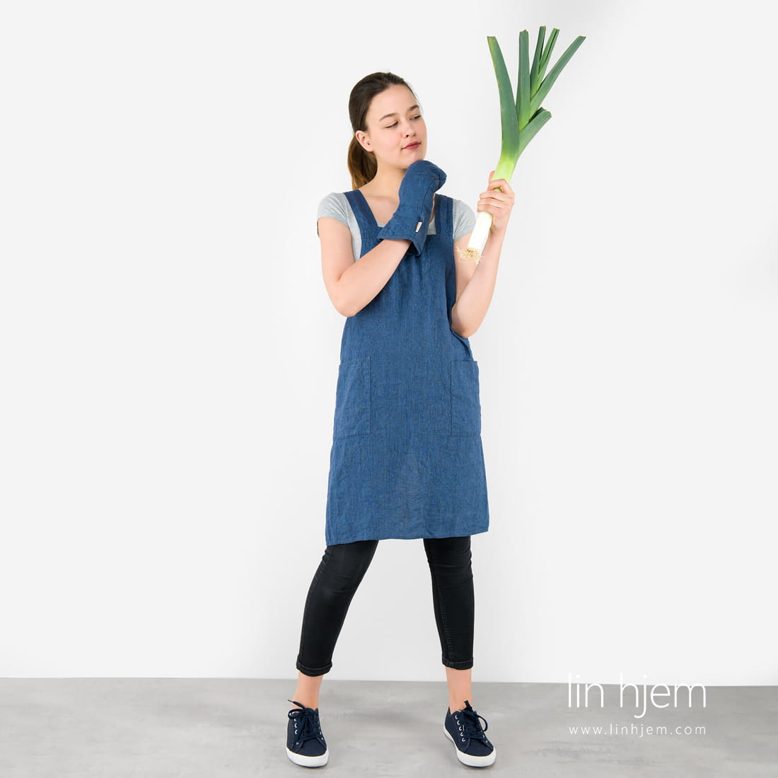 Blått linforkle med lommer og seler. Produktet er laget av 100% linstoff vevd fra jeans blå og mørkeblå garn. Stoffet er spesielt vasket som gjør dette forkleet ekstremt mykt, skånsomt og behagelig å ha på. Krymper ikke. Perfekt gave til familien, venner og kjente!