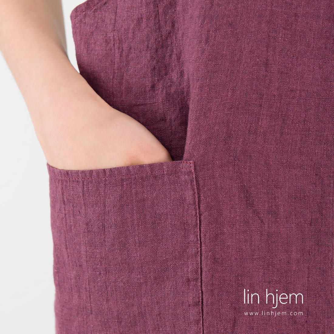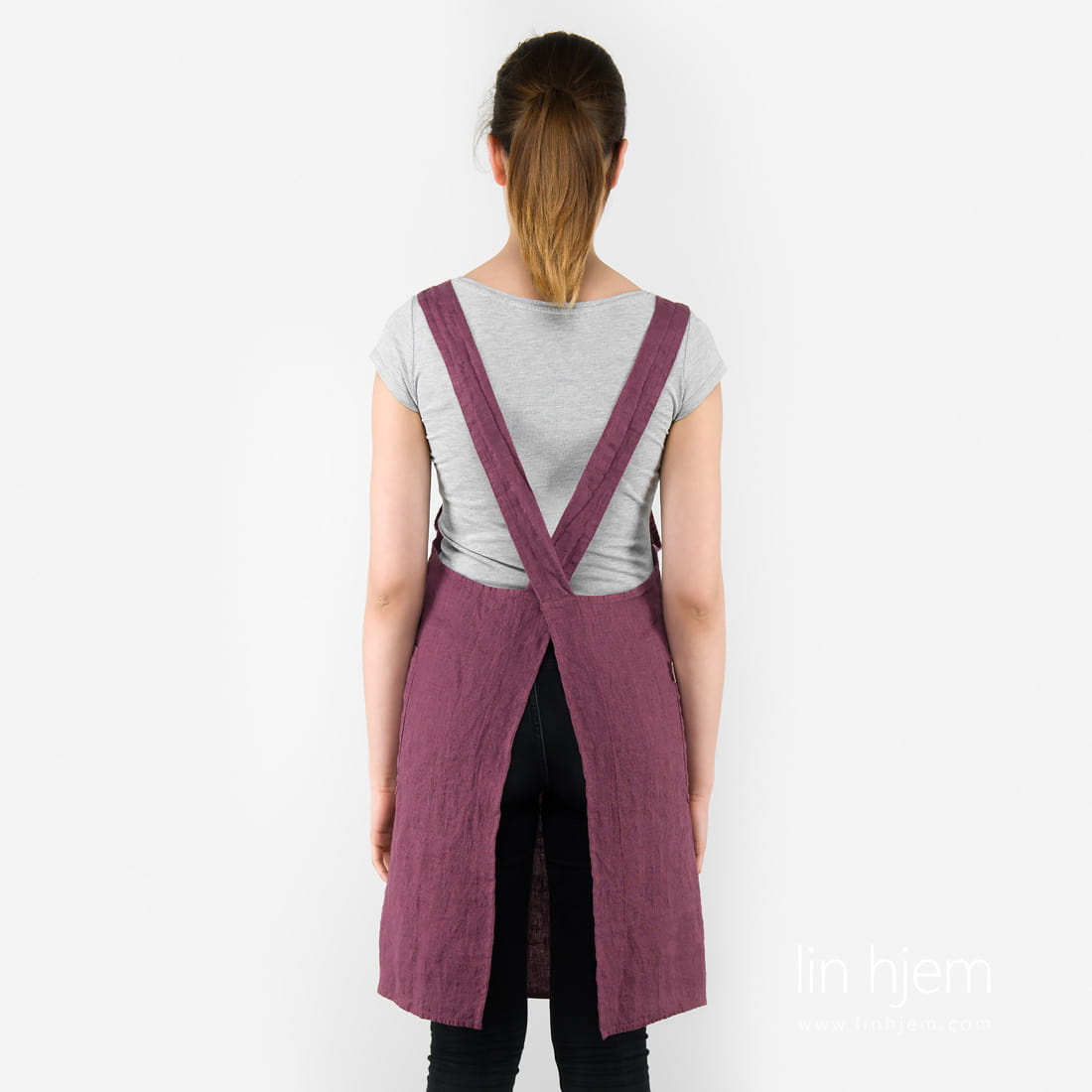 Mørkerødt linforkle med lommer i front. Laget av mykt, skånsomt vasket stoff. Dette forkleet er med brede seler som er veldig komfortabelt å ha på. Koselig forkleet er det du trenger når du lager middag hjemme!