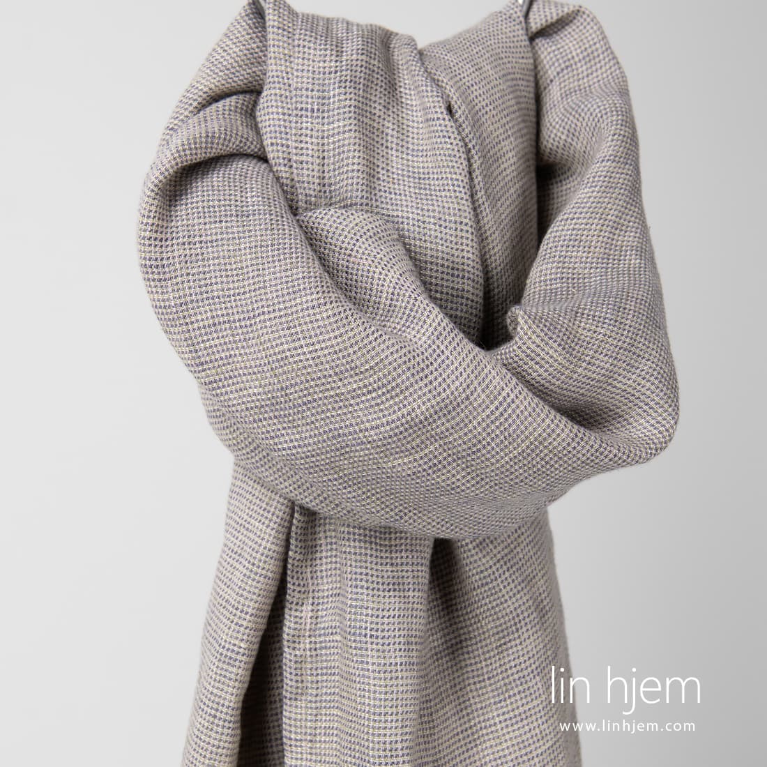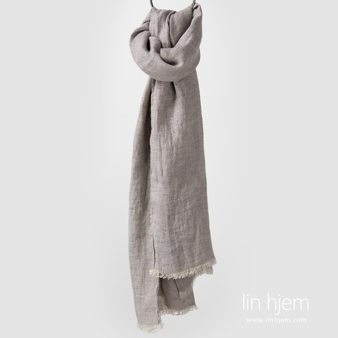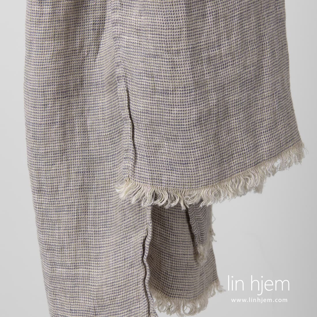 MEINO gråaktig sjal. Lett linstoff for dette produktet er vevd i små ruter av sand farget, gammelgrønne og lilla garn. Sjalet er laget av spesielt vasket stoff som er ekstremt mykt, skånsomt som ikke krymper. Korte sidene er dekorert med 2cm lange frynser.