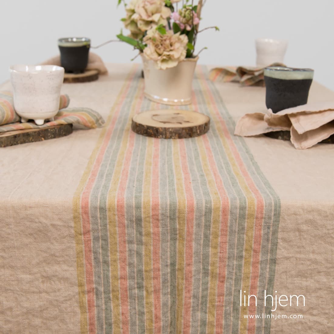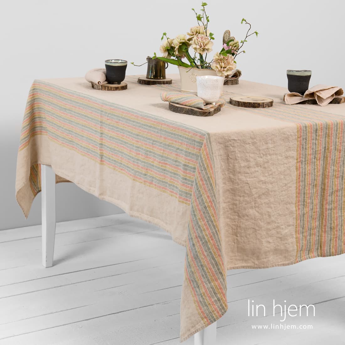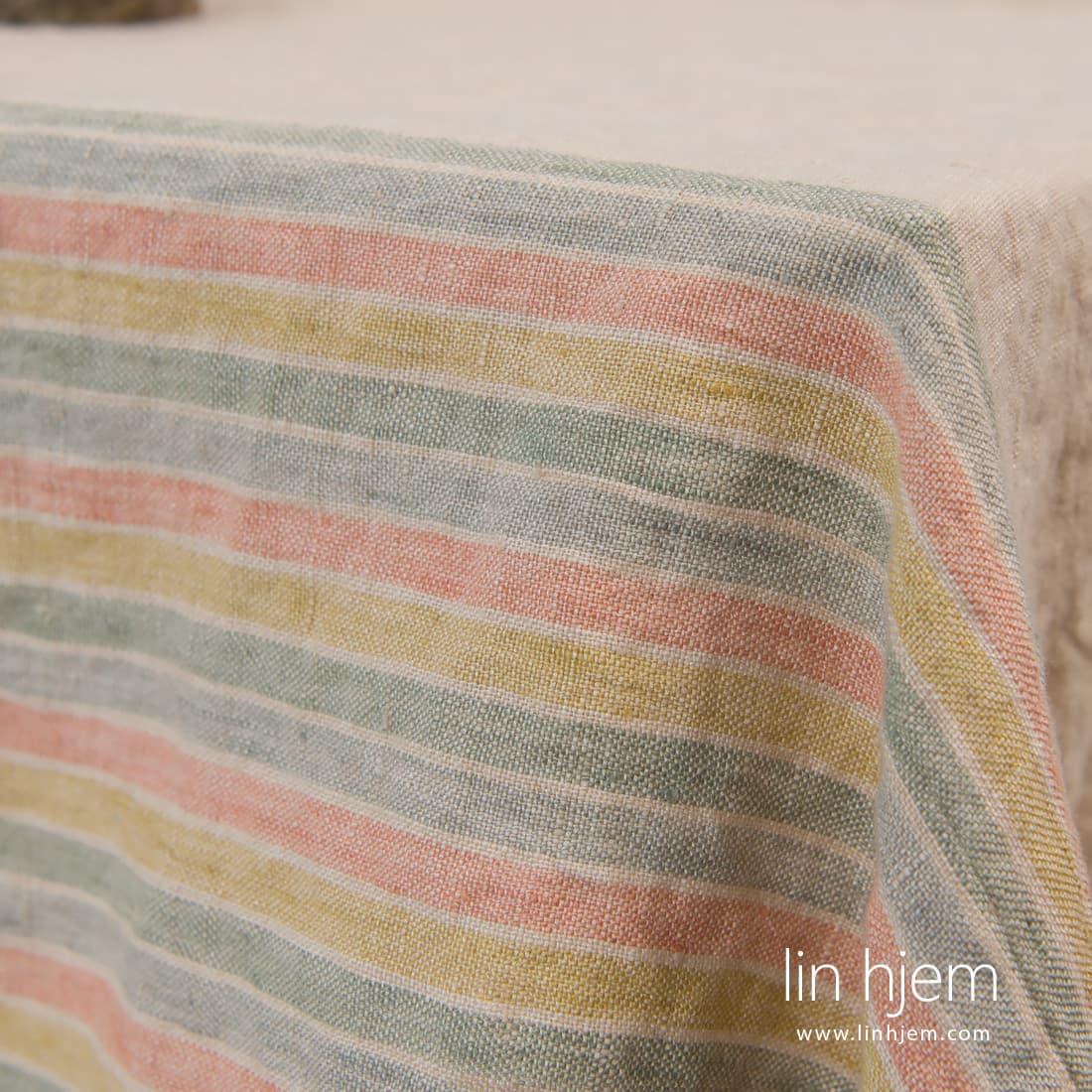 MEIZA brunaktig duk vevd i brede brunaktige striper og fargerike striper. Striper ble vevd av gammel grønne, grå, gule og brun-røde lingarn. Stoffet ble spesielt vasket med ny teknologi som gjør duken myk, skånsom og har ujevn overflate. Krymper ikke. Varme farger og fargerike striper passer perfekt for den varme sesongen. Både for spesielle anledninger og hverdag!