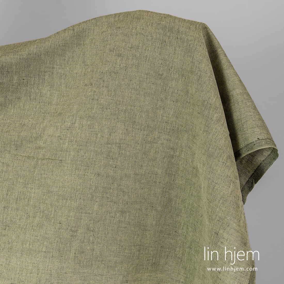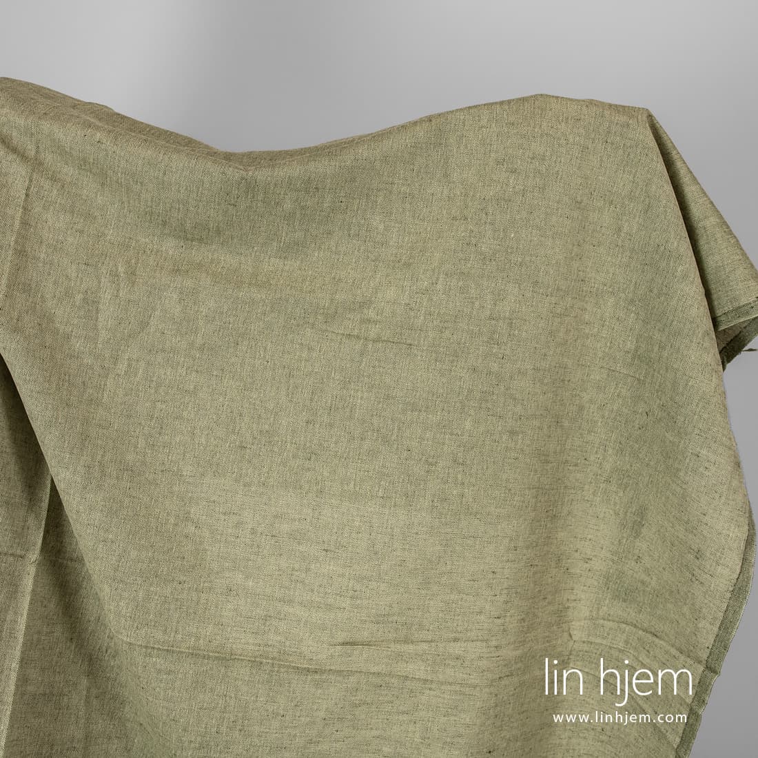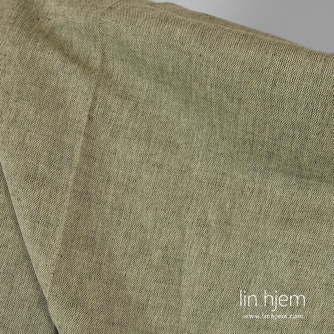 Melange grønt halvlin stoff vevd av mørke brun-grønne lingarn og intens grønne bomullsgarn. Lett, holdbart, tettvevd, middels tykkelse. Passer til klær og hjem tekstil produkter.
