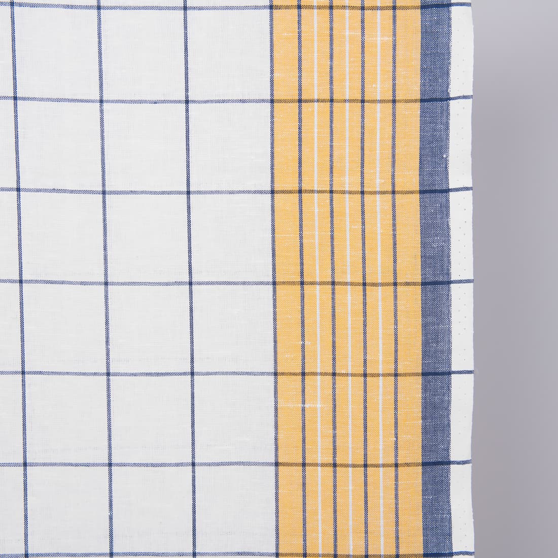 Smalt lin-bomullsstoff i ruter hvit gul blå