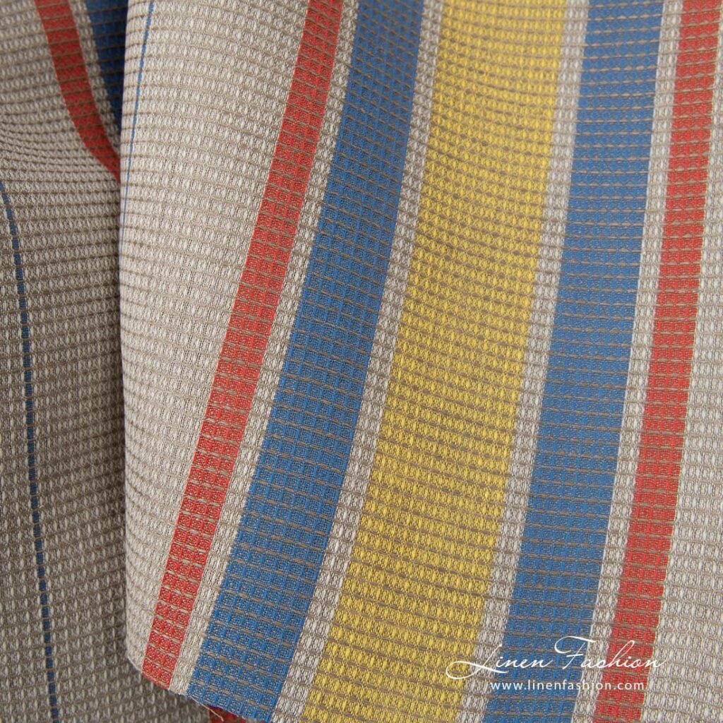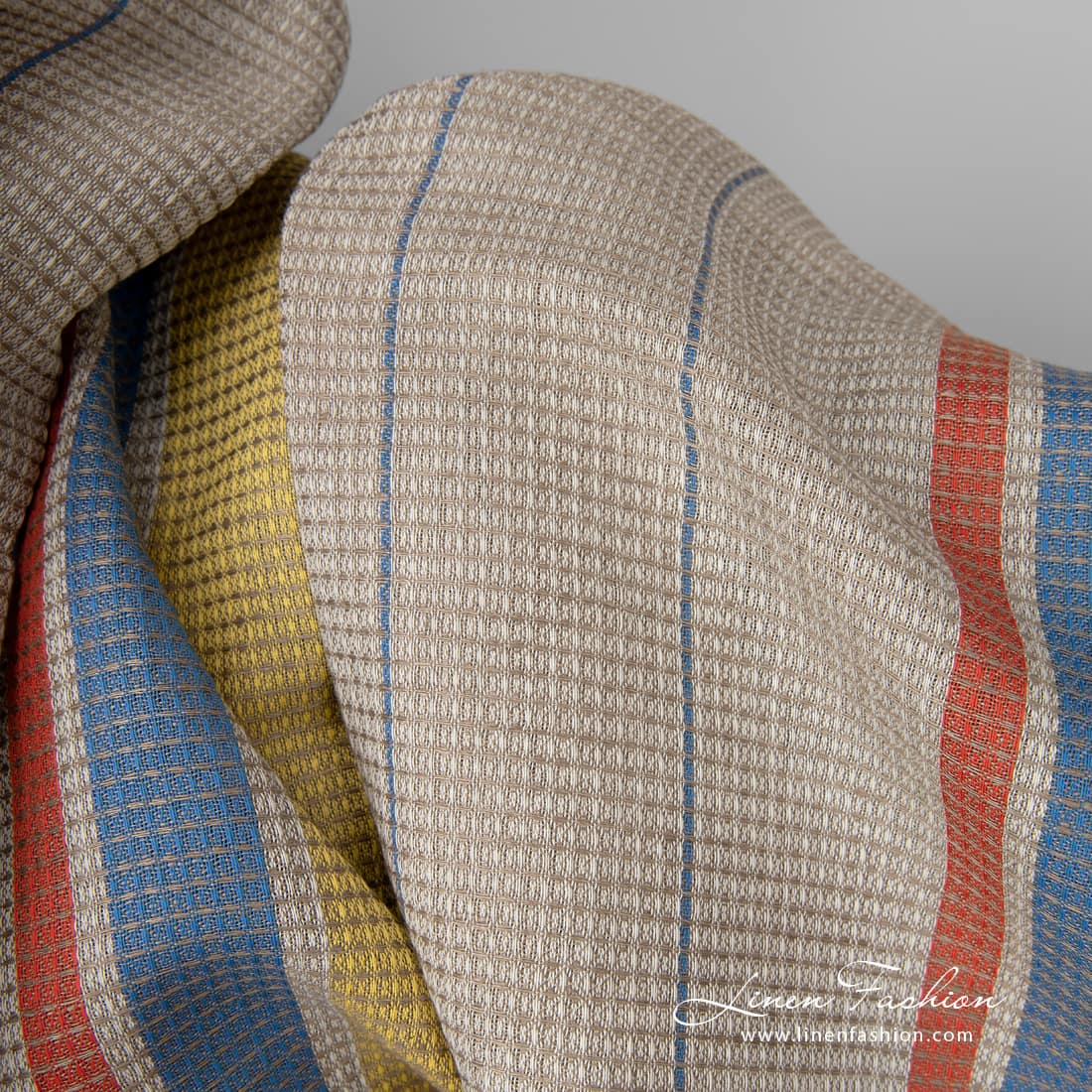 Lin-bomullsstoff sandfarget vaffelvevd med gul-røde striper