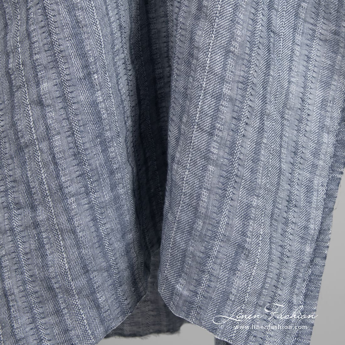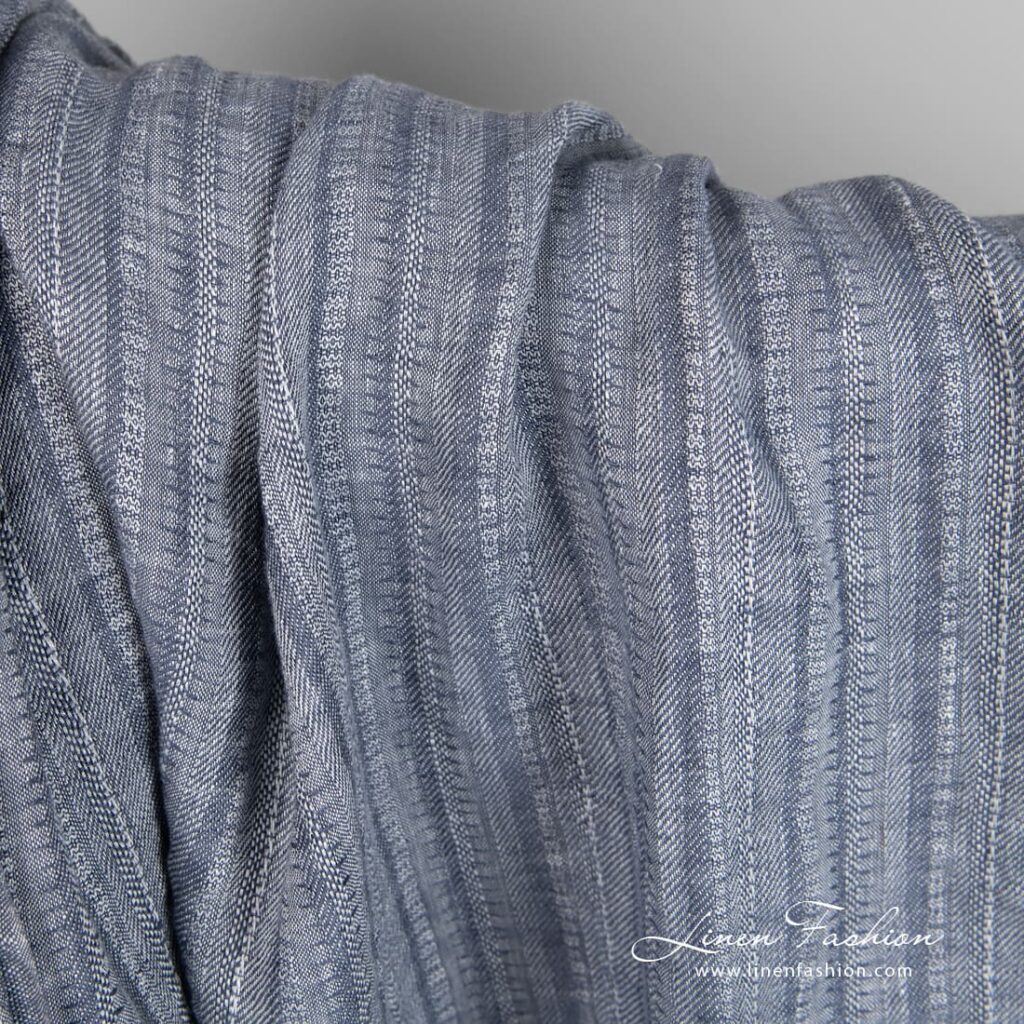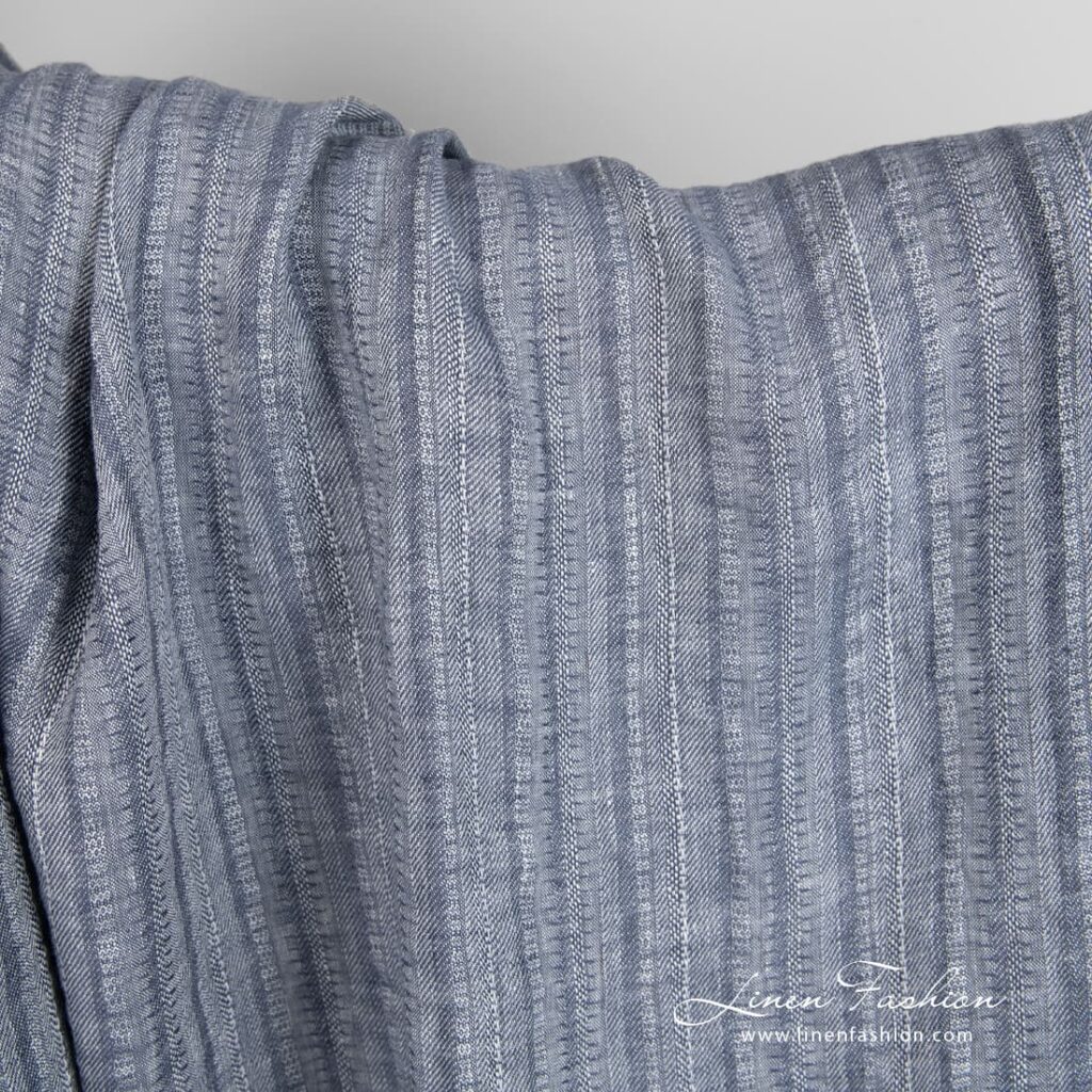 Blågrått linstoff i vertikale striper vasket